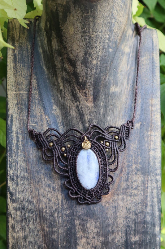 Dunkelbraunes Makramee Collier mit Rubinzoisite