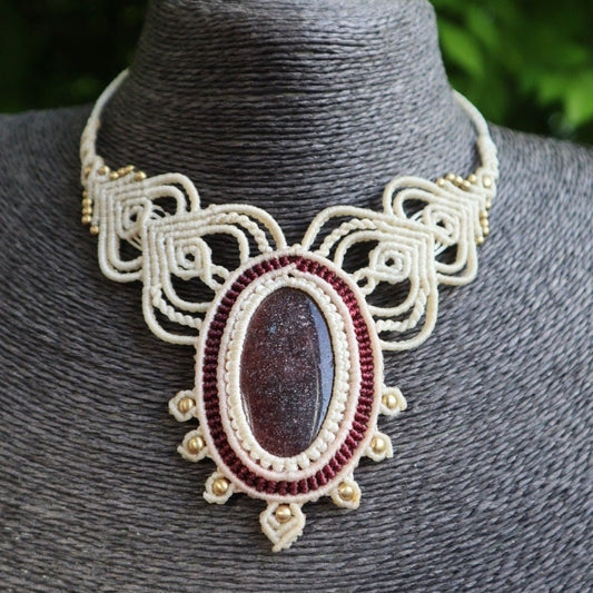 Makramee Collier mit dunkelrotem Goldfluss Stein, weiß und rot