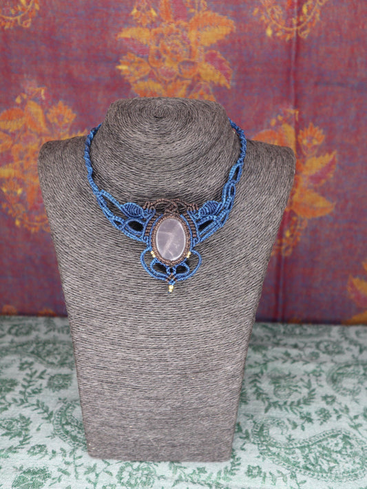 Makramee Collier mit Rosenquarz, blau mit braun