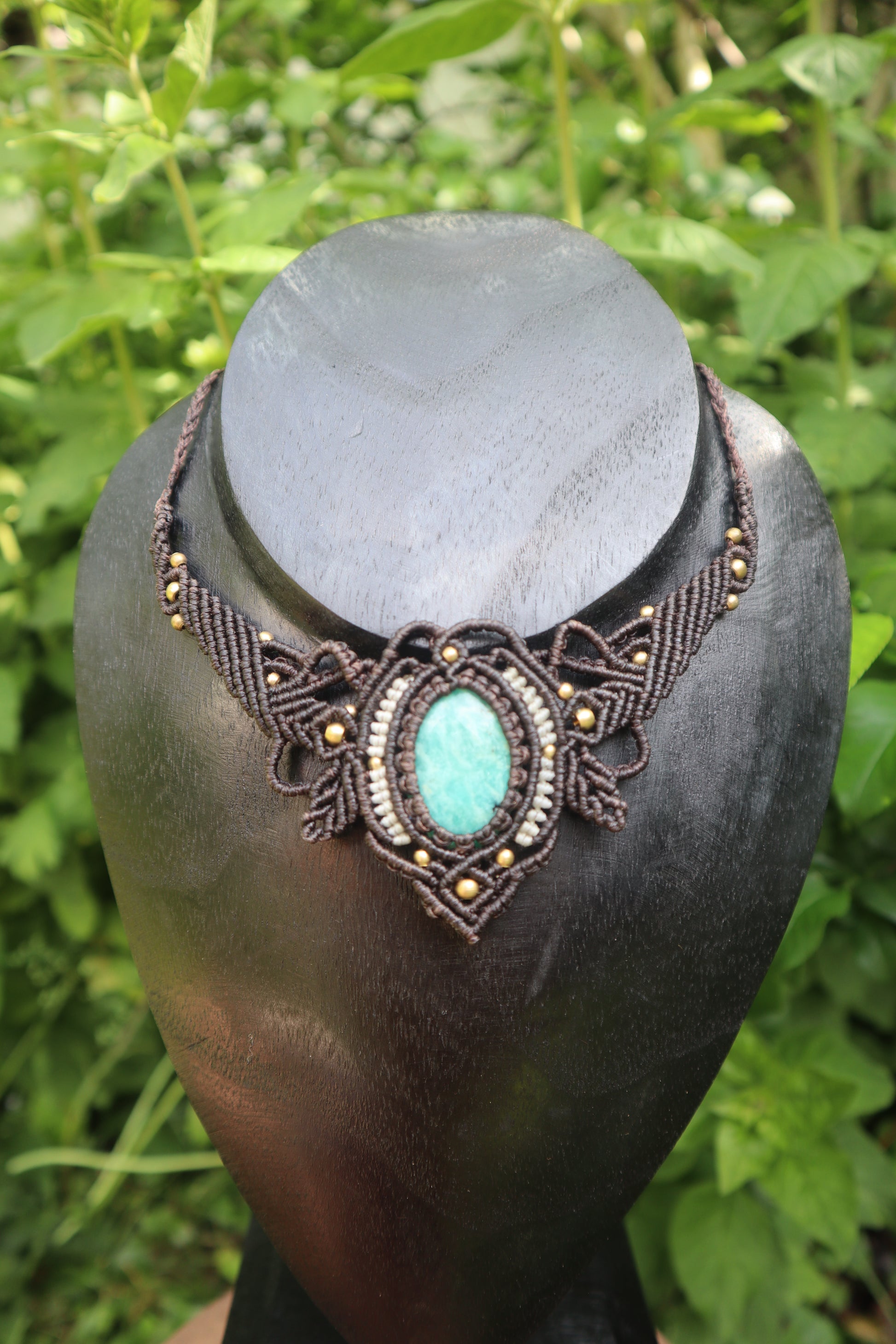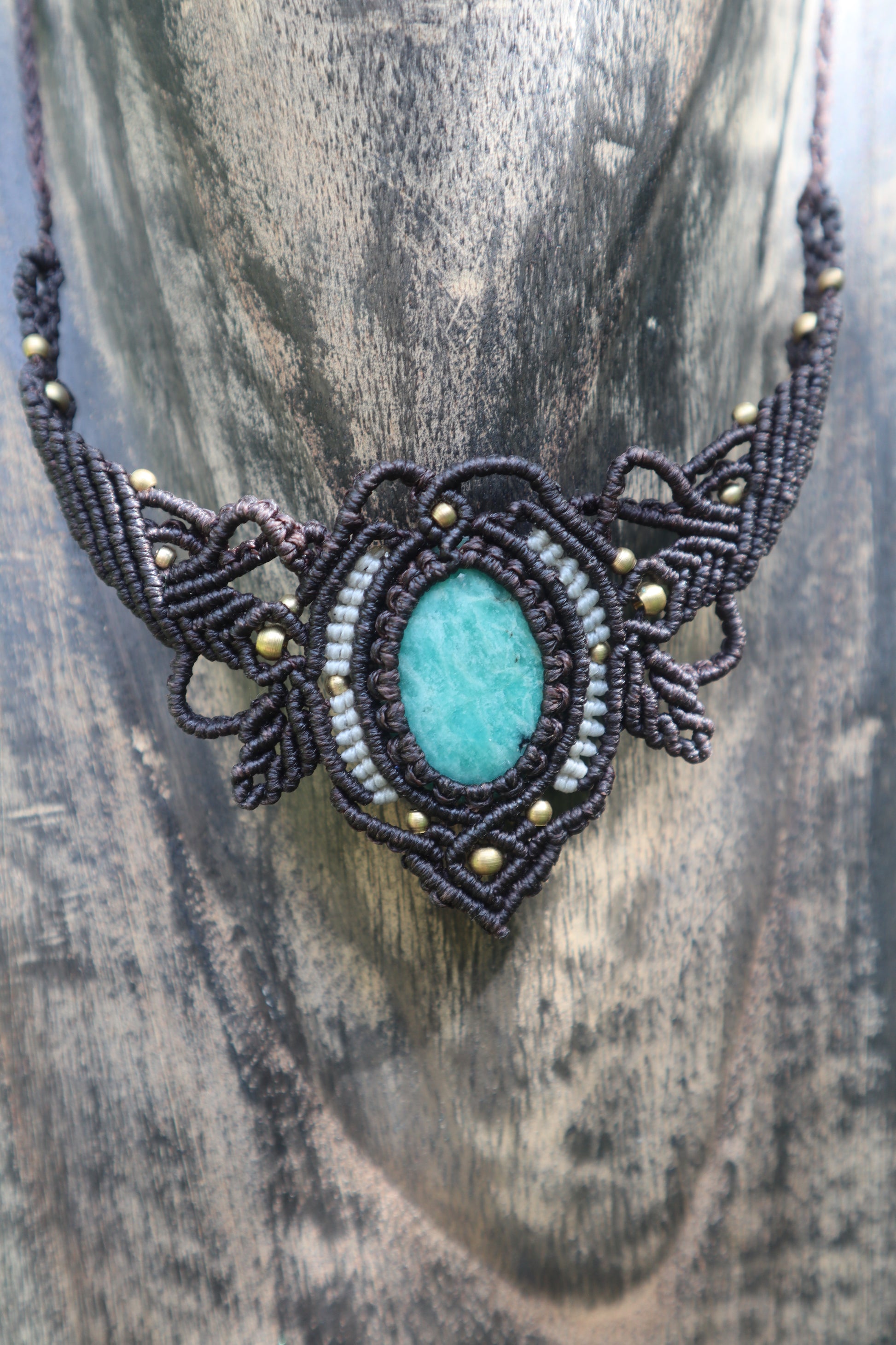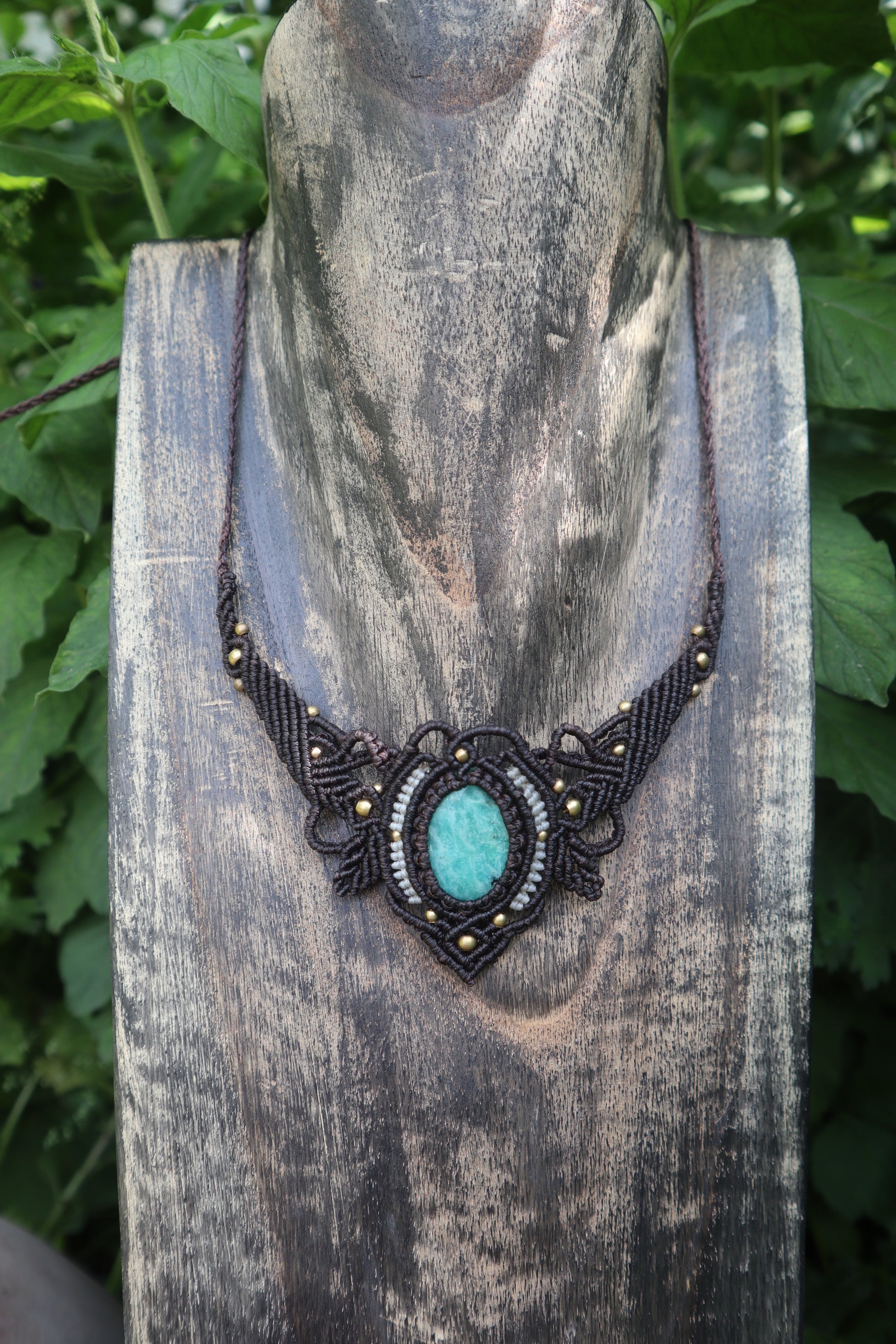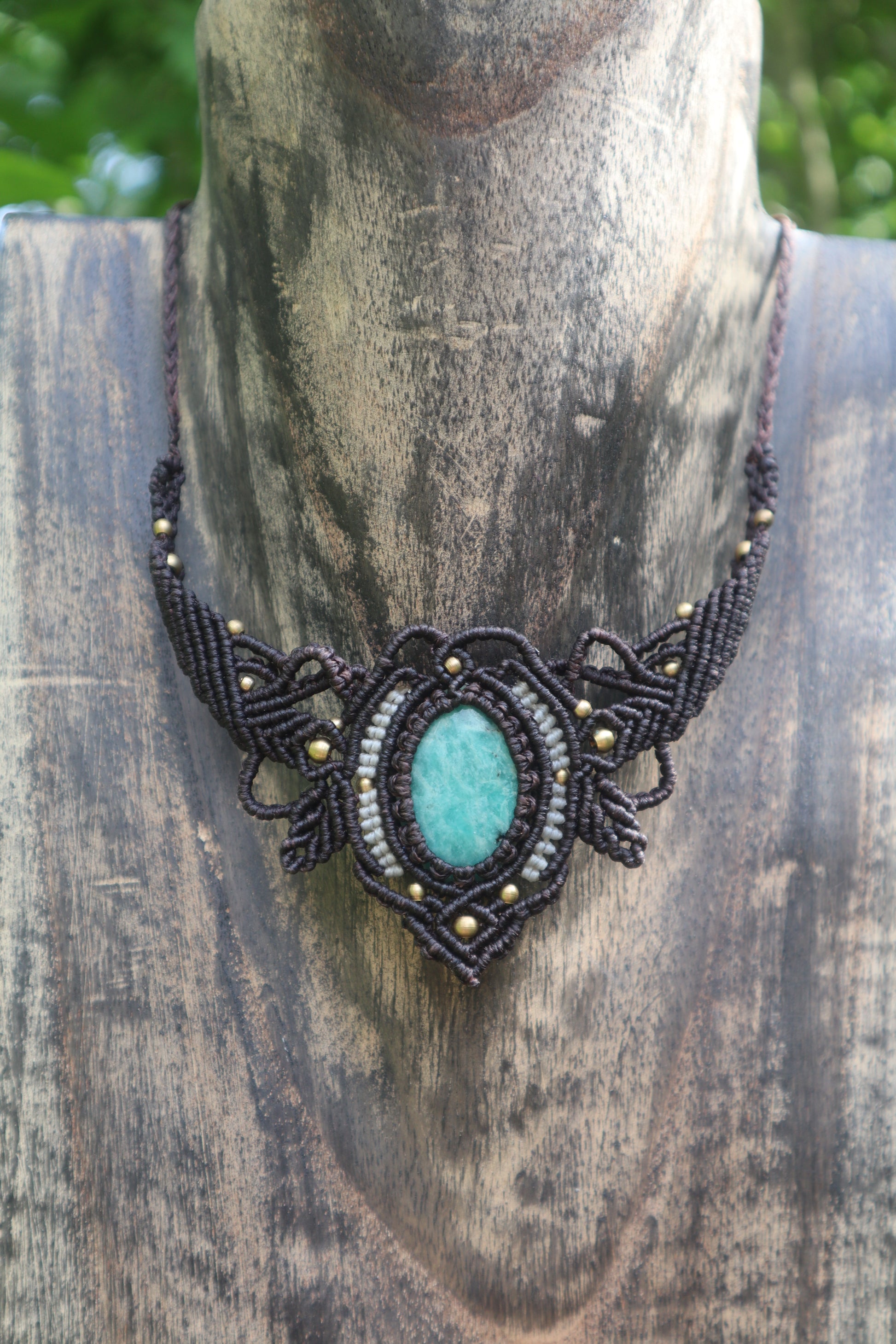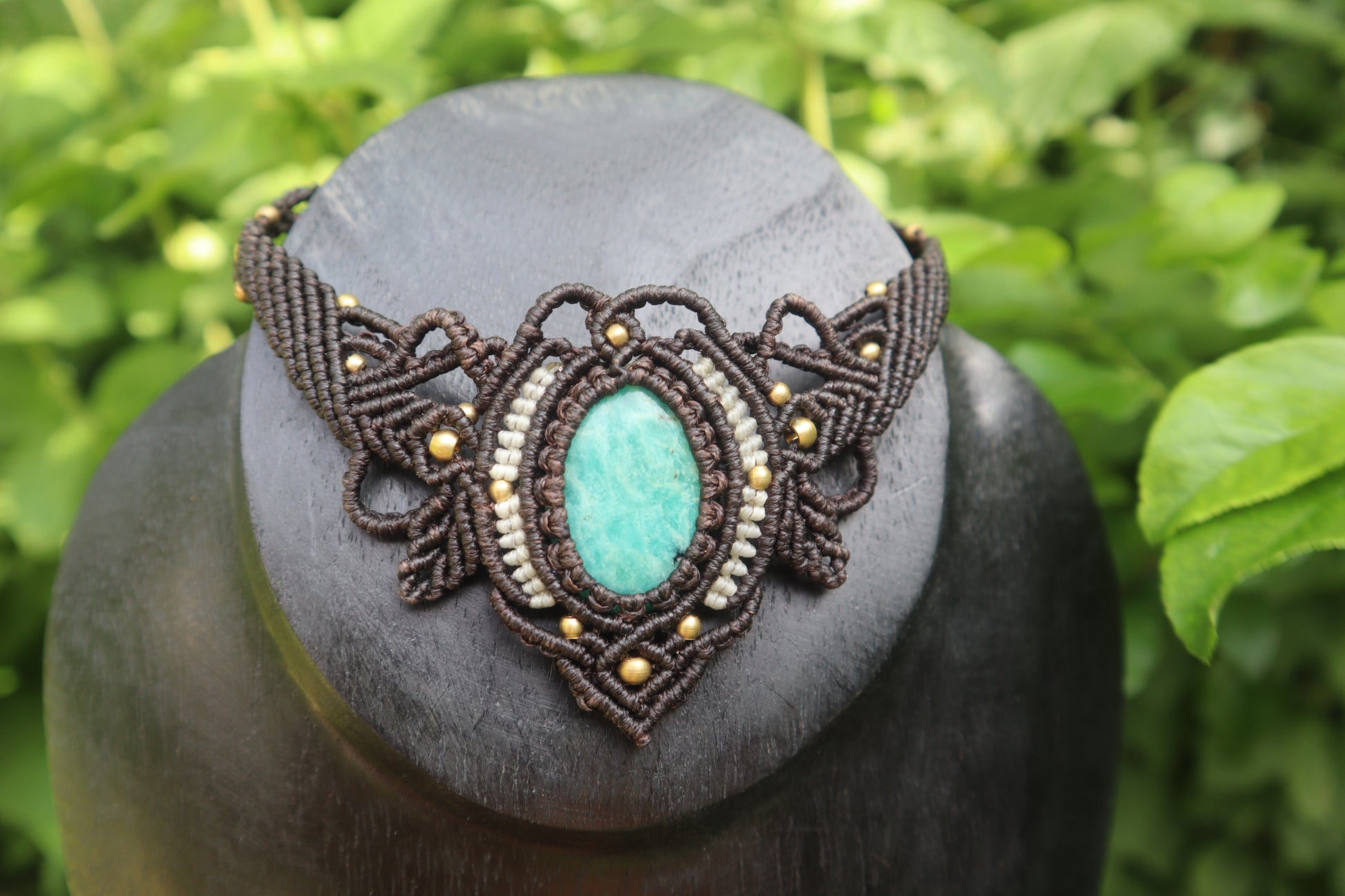 Seine Wirkung erzielt der Stein durch Berührung, aber auch durch meditatives Betrachten. Er wird von der Macrameknüpfung nur eingefasst und nach hinten zur Haut hin offen. Der Stein misst etwa 3,2 mal 2,8cm.