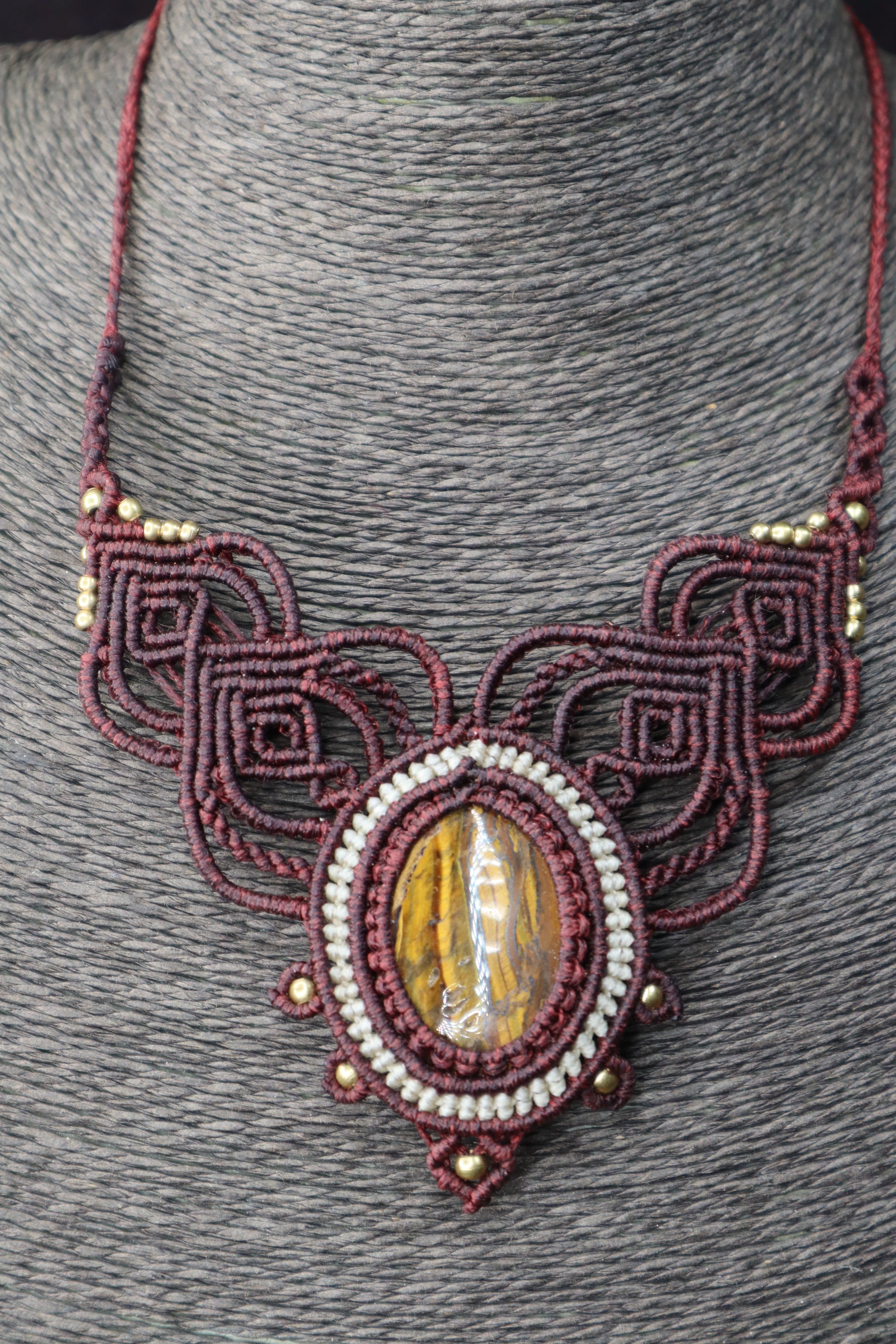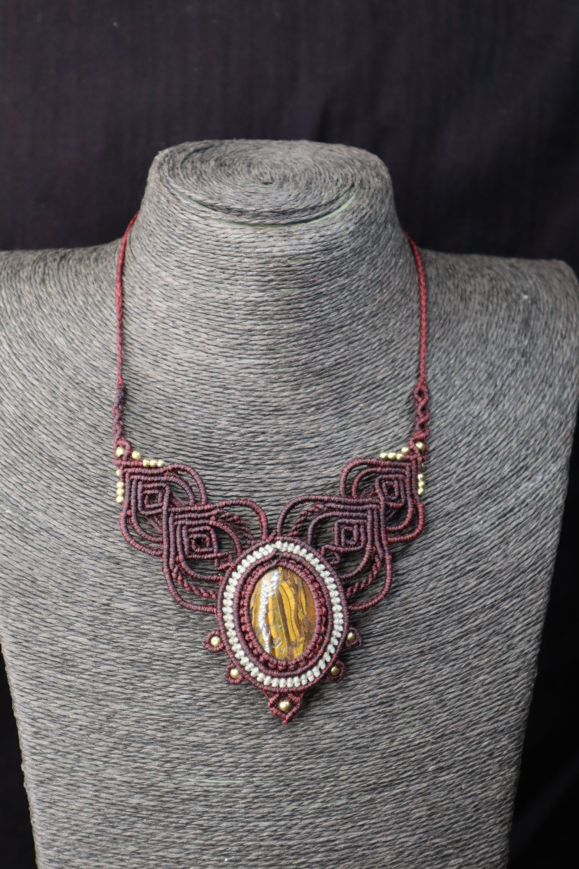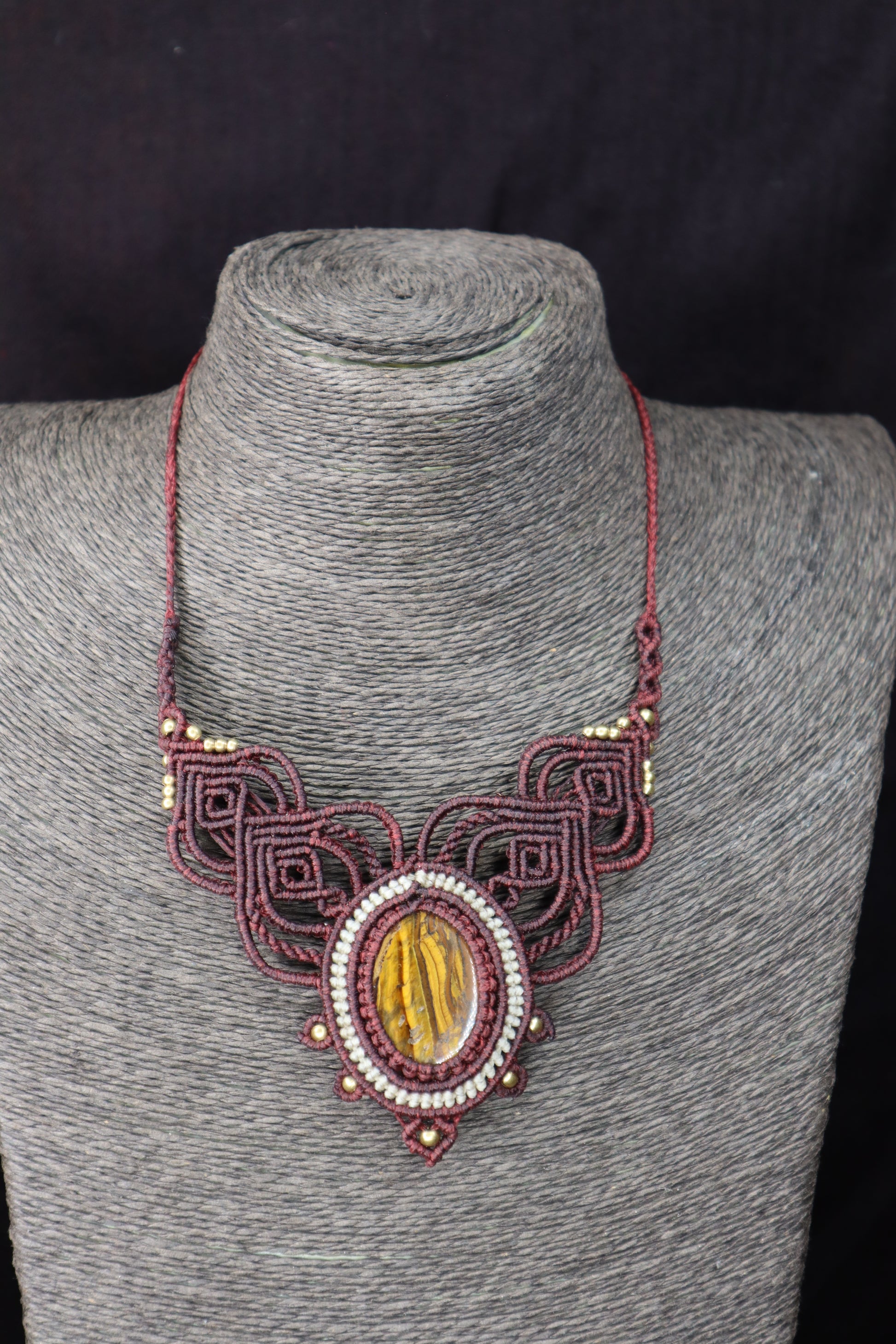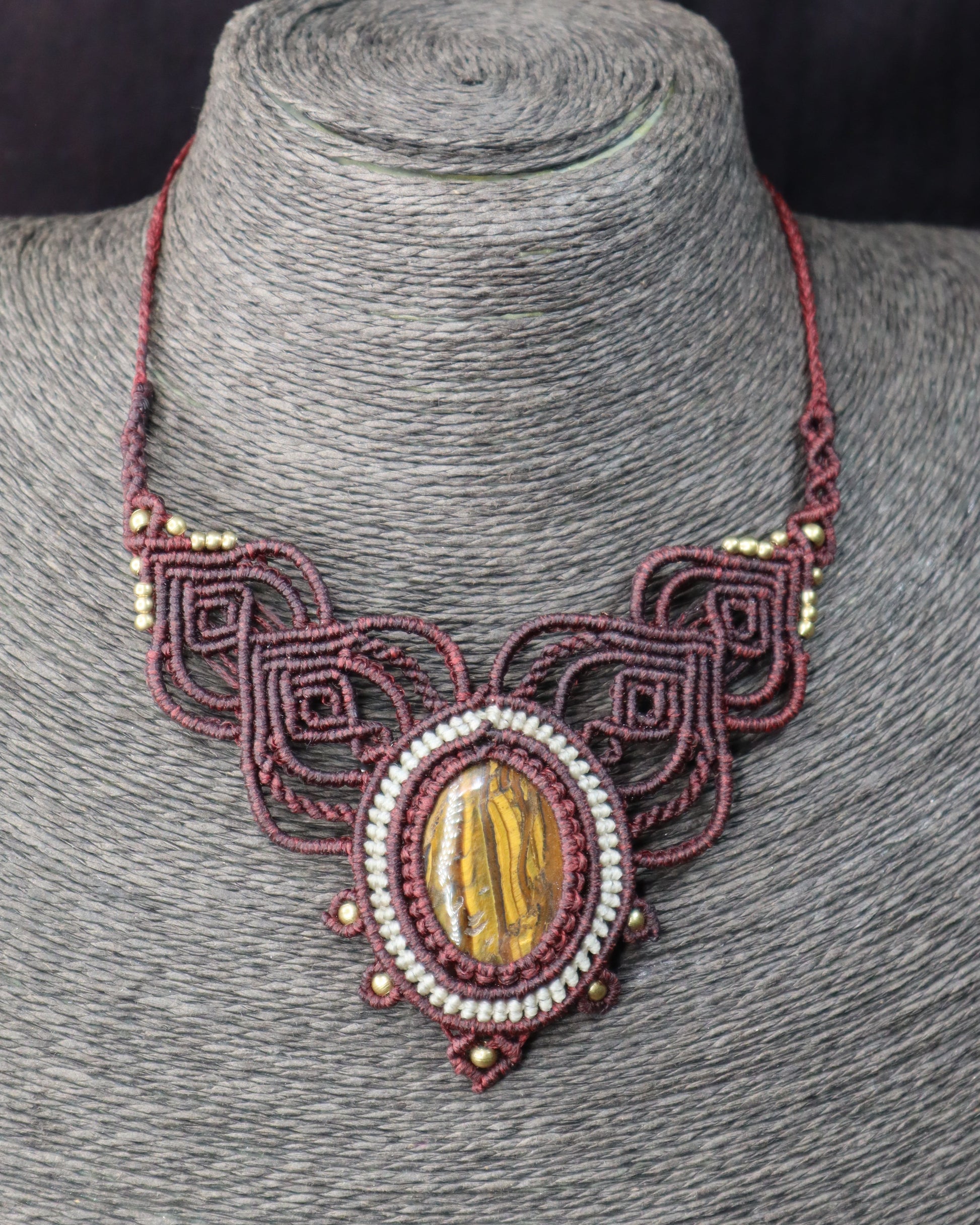 Bordeauxfarbenes Makramee Collier mit Eisentigerauge