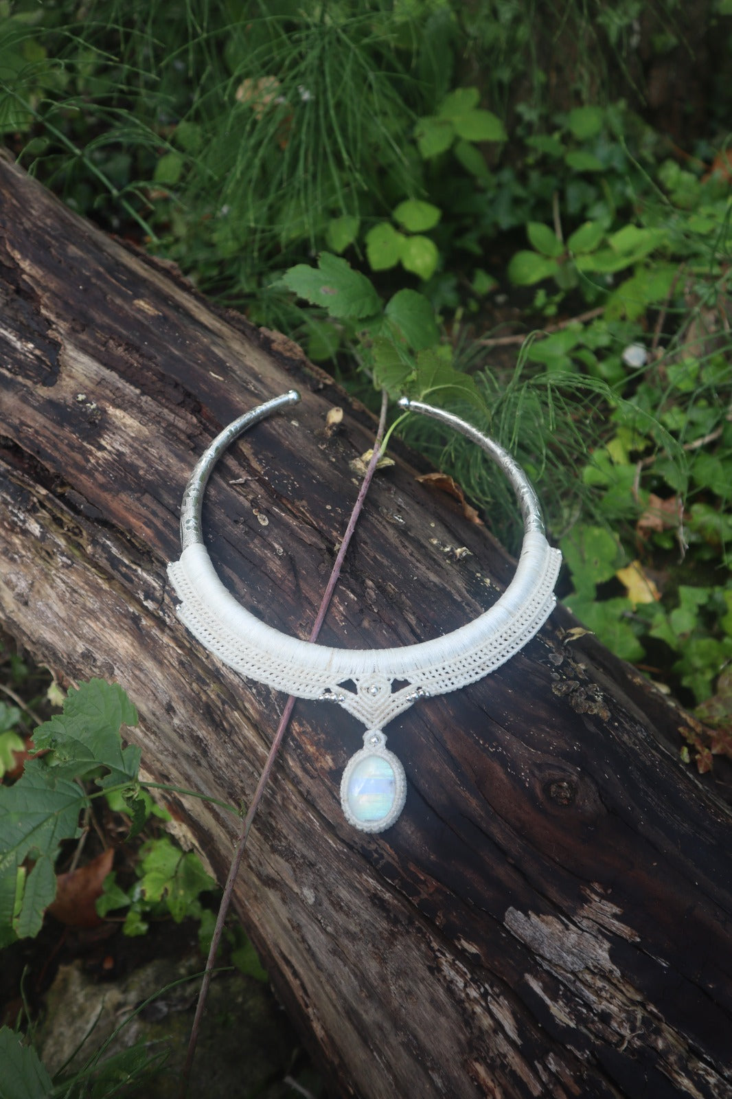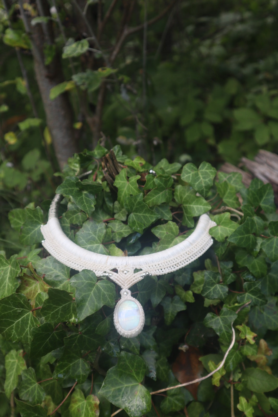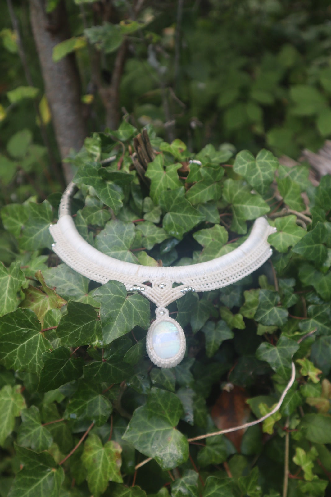 Eine einzigartige handgefertigte Halskette mit einem changierenden ovalen Edelstein, der in naturweißes Makramee gehüllt ist. Der Stein zeigt ein natürliches Schillern mit Blau-, Gold- und Silberreflexen, die durch Silberfarbene Metallperlenakzente wunderschön ergänzt werden. Dieses Stück im auffälligen Choker-Stil verbindet Bohème-Eleganz mit handwerklicher Handwerkskunst und ist damit ein perfektes Statement-Accessoire für jeden Anlass.