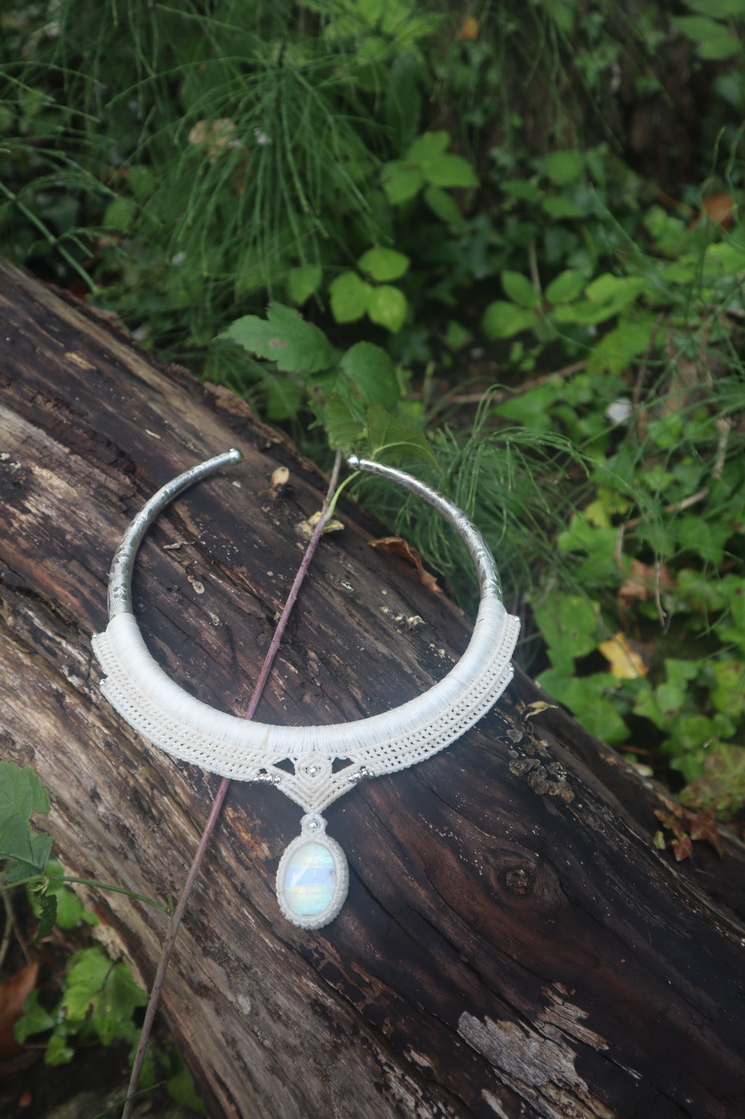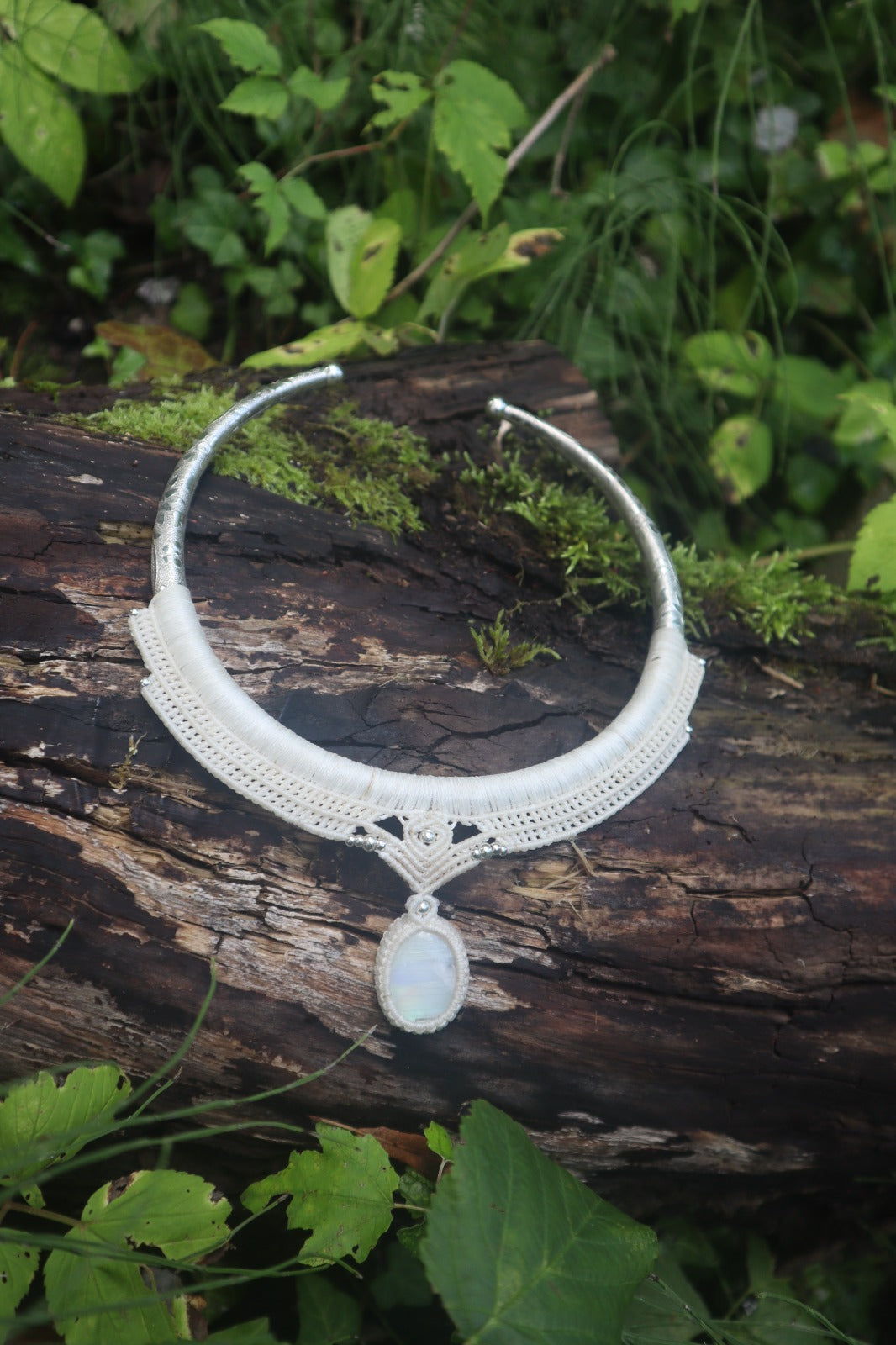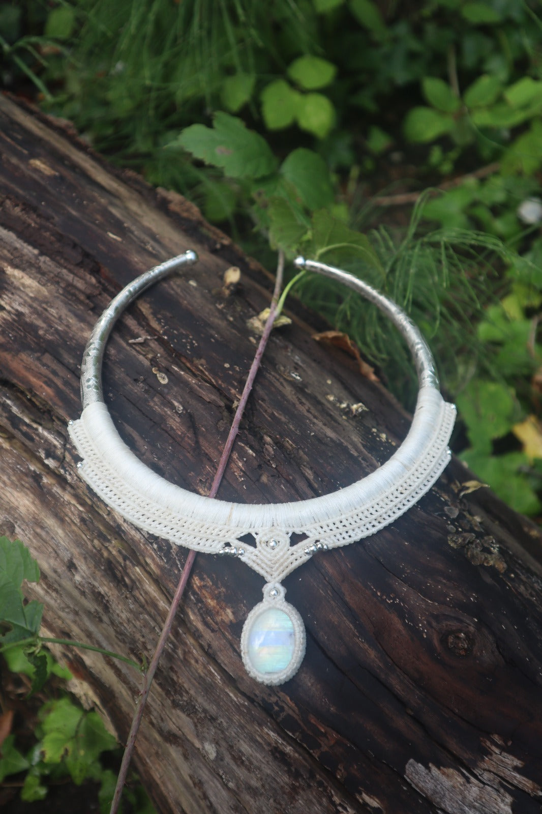 Eine einzigartige handgefertigte Halskette mit einem changierenden ovalen Edelstein, der in naturweißes Makramee gehüllt ist. Der Stein zeigt ein natürliches Schillern mit Blau-, Gold- und Silberreflexen, die durch Silberfarbene Metallperlenakzente wunderschön ergänzt werden. Dieses Stück im auffälligen Choker-Stil verbindet Bohème-Eleganz mit handwerklicher Handwerkskunst und ist damit ein perfektes Statement-Accessoire für jeden Anlass.