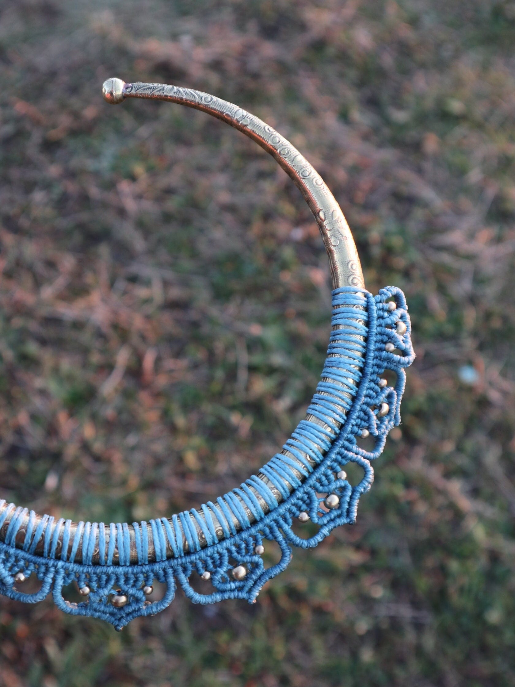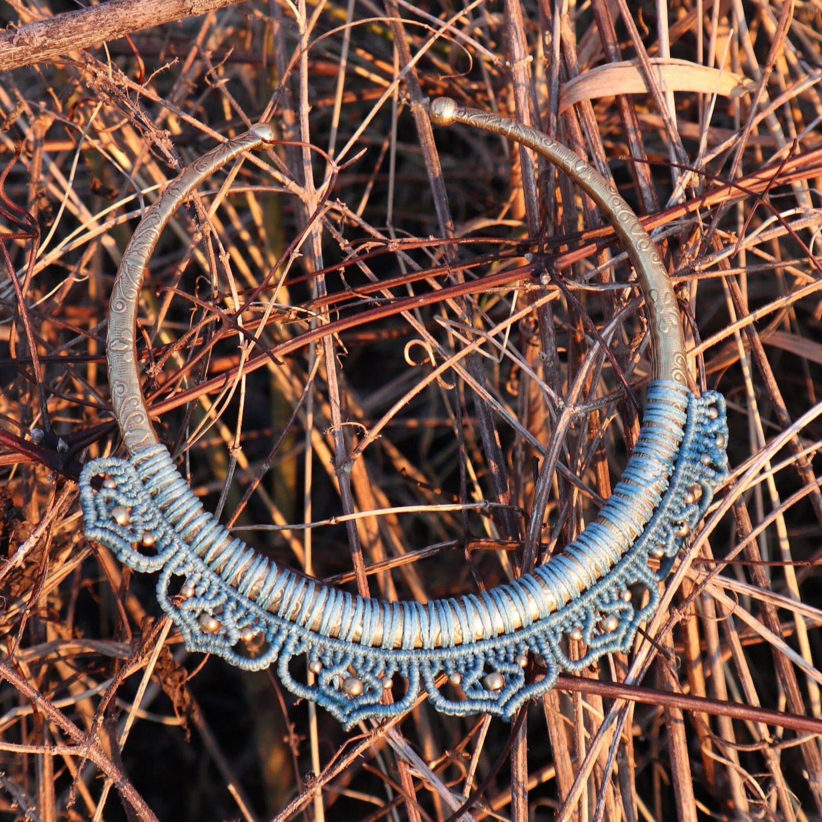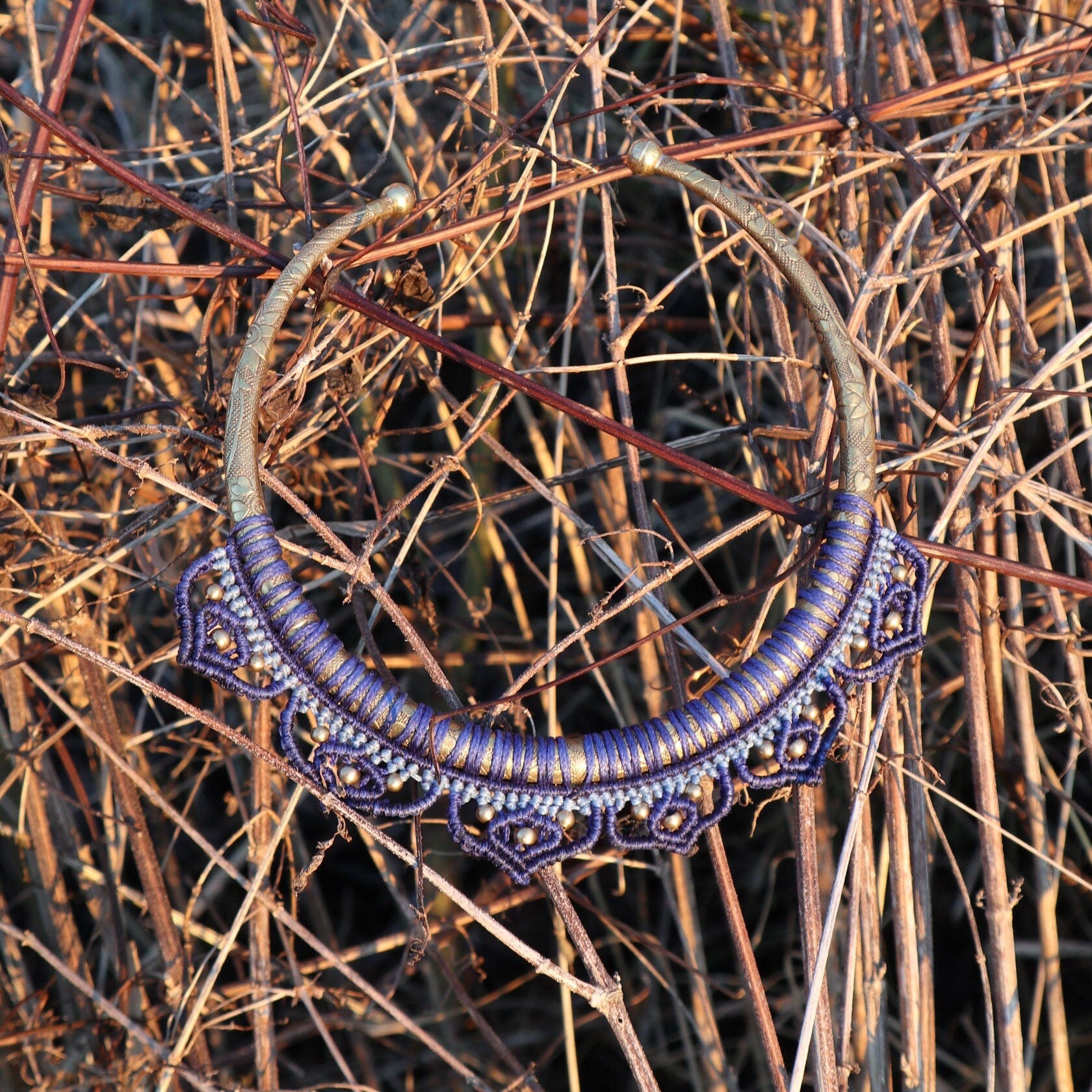 Handgearbeiteter Halsreifen aus Messing mit Makramee