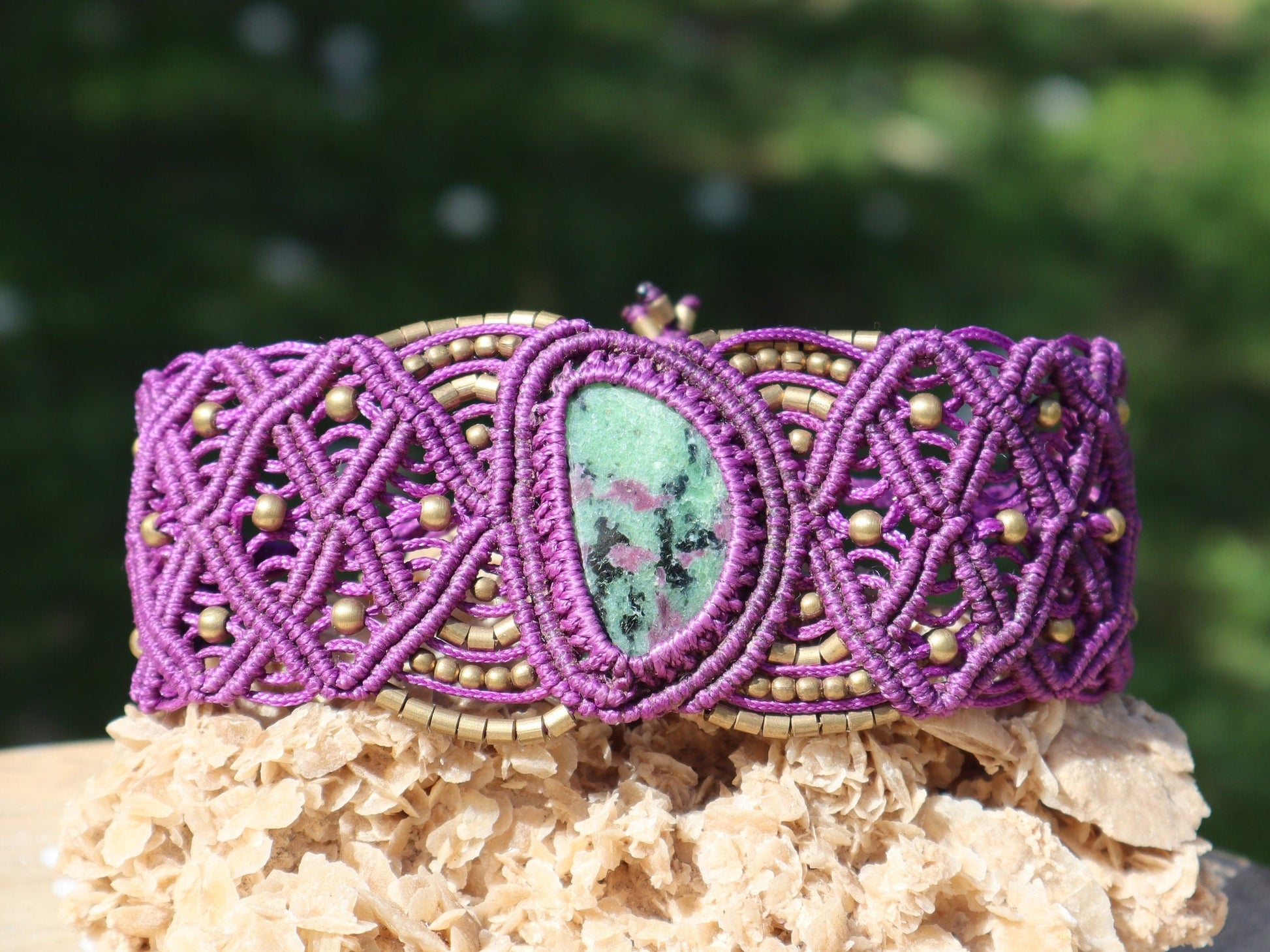Wunderschönes handgefertigtes Macrameearmband in einer breathtaking Collourcombination mit Rubinzoisit, dass durch einen Schiebeverschluss an jedes Handgelenkt angepasst werden kann.