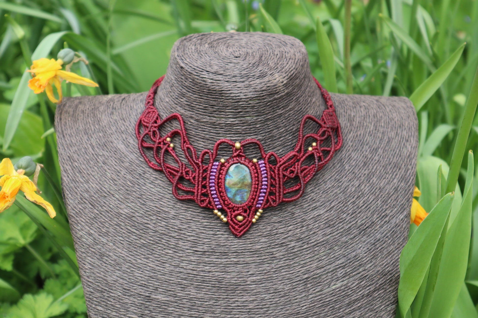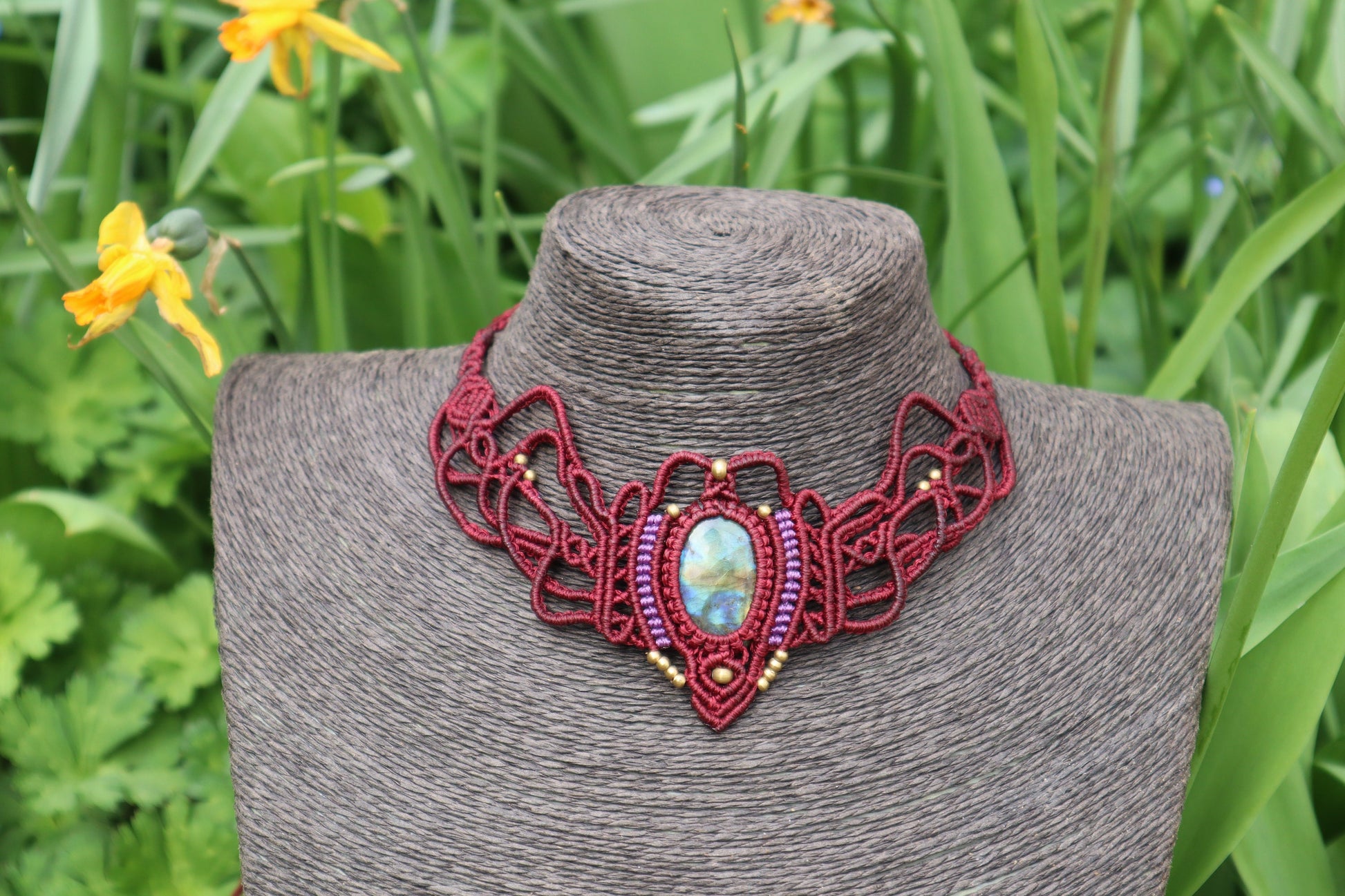 Handgefertigte Makramee Halskette mit eingefassten Halbedelstein.