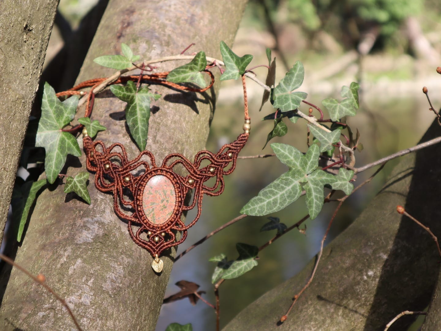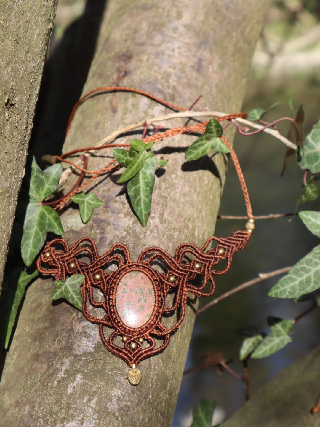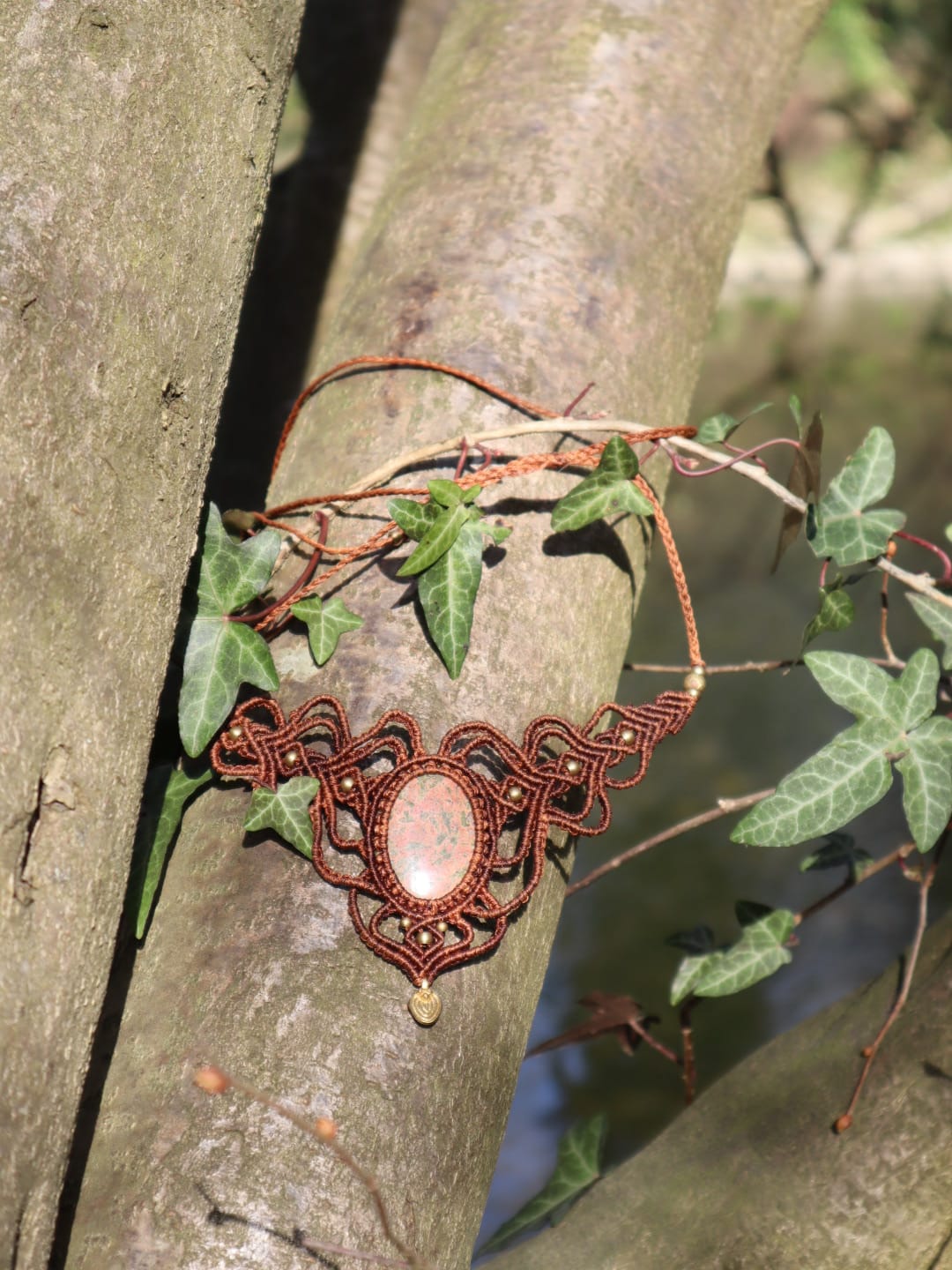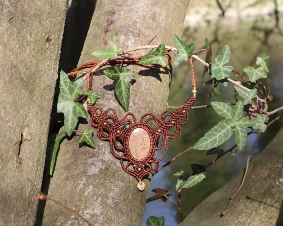 Handgefertigte Makramee-Kette mit lieblichem Jaspis. Wie Sie auf den Bildern sehen können, handelt es sich um einen besonders schönen Stein. Die Kette verfügt über einen praktischen Schiebeknoten, sodass die Länge nach Belieben angepasst werden kann. Die Wirkung des Steins ist sowohl beim Berühren als auch bei meditativer Betrachtung spürbar. Durch die Makramee-Knotung wird er nur fixiert, nicht geklebt.
