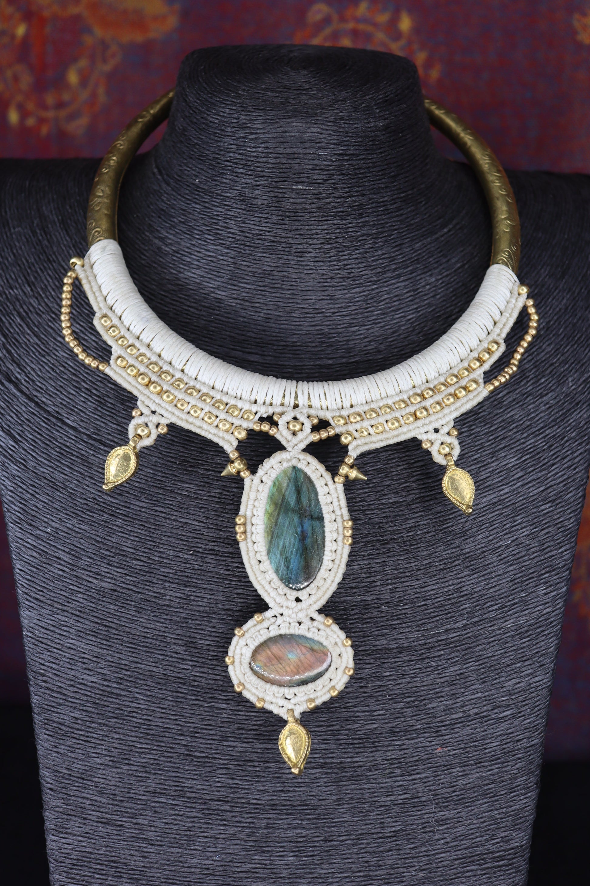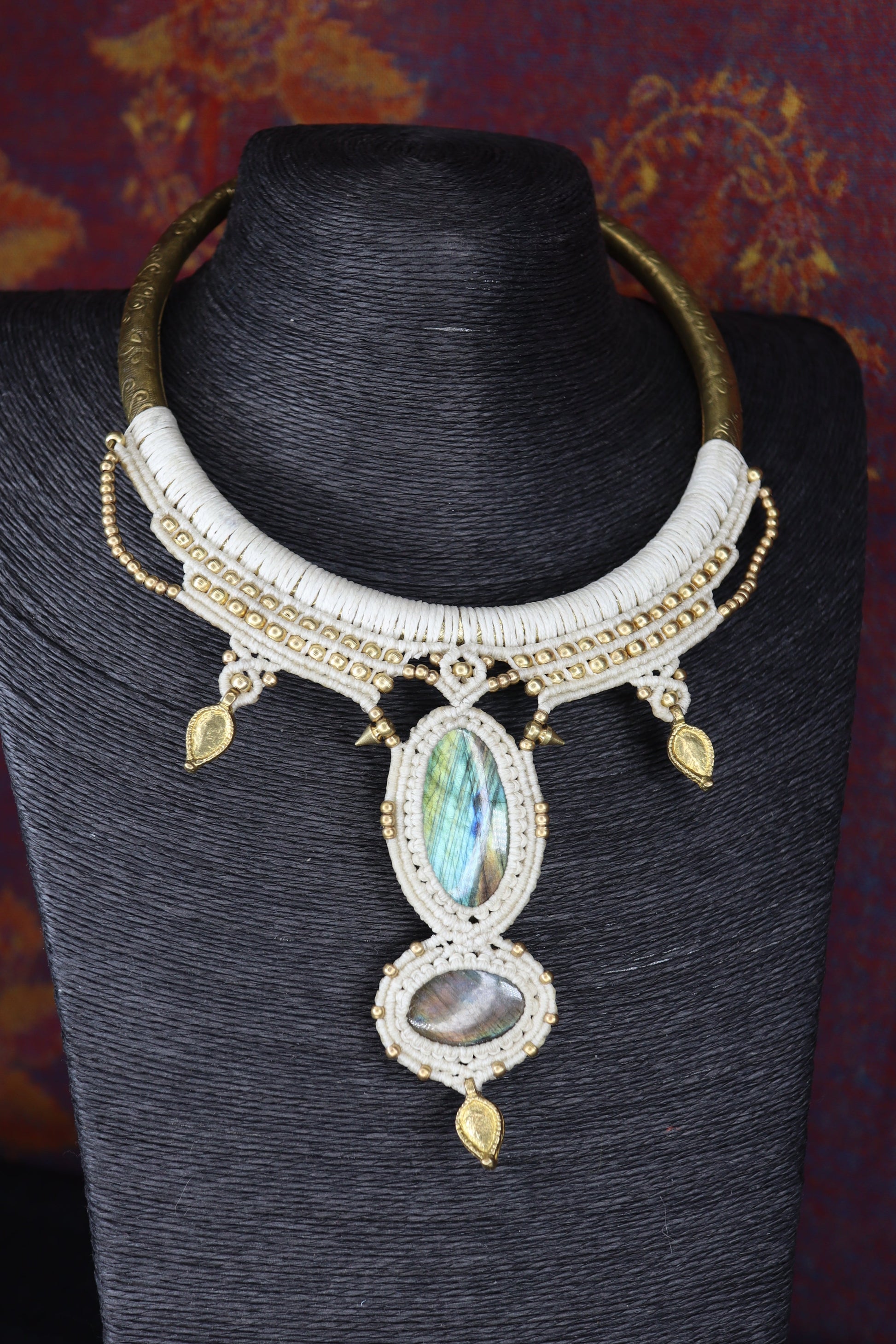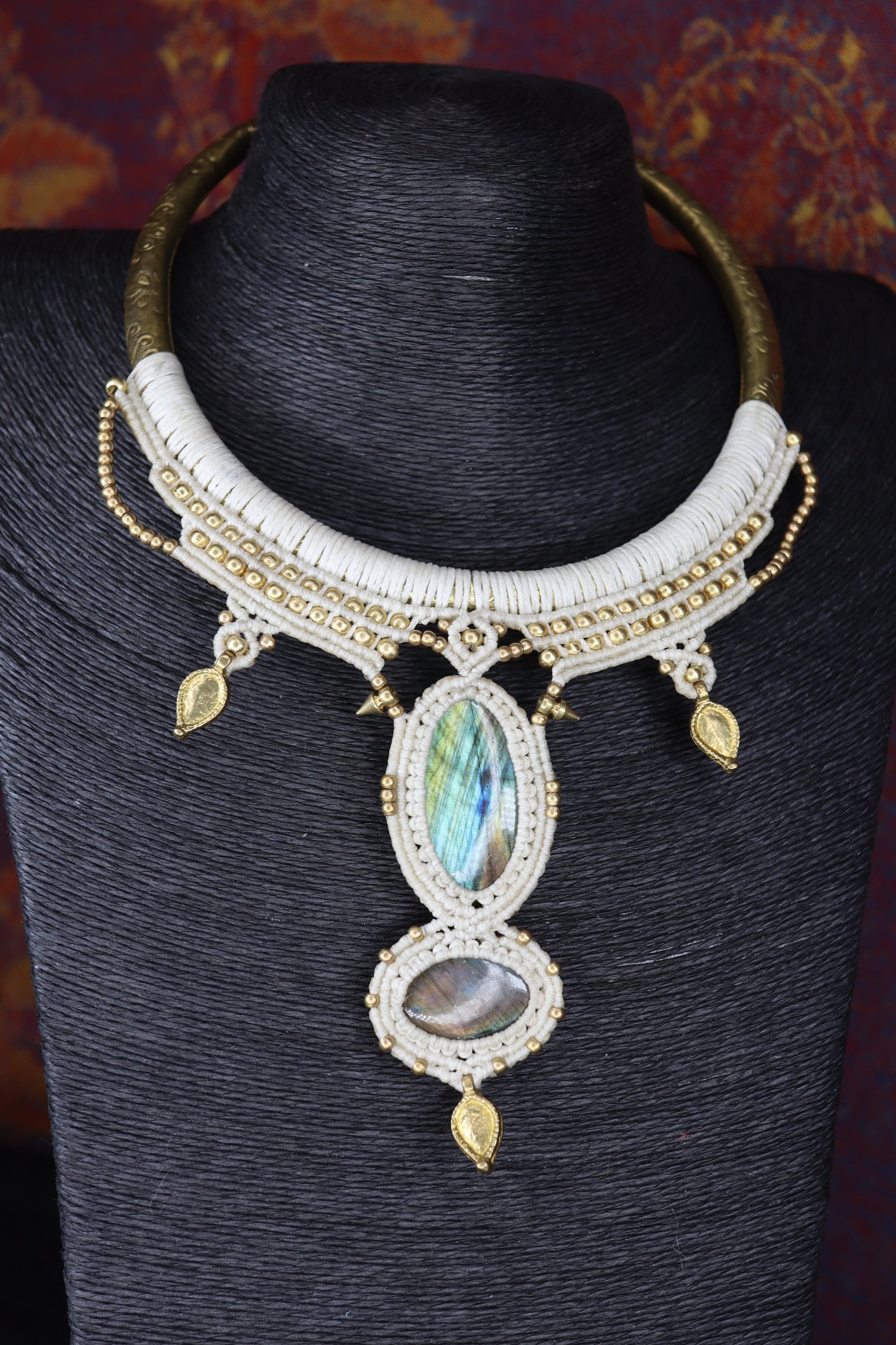 Halsreifen sind Schmuckstücke mit Kompliment Garantie, wie dieser hier mit bezaubernden Labradoriten und goldfarbenen Messing Perlen und Elementen. Der Reifen und die Knüpfung wurden in Handarbeit hergestellt.