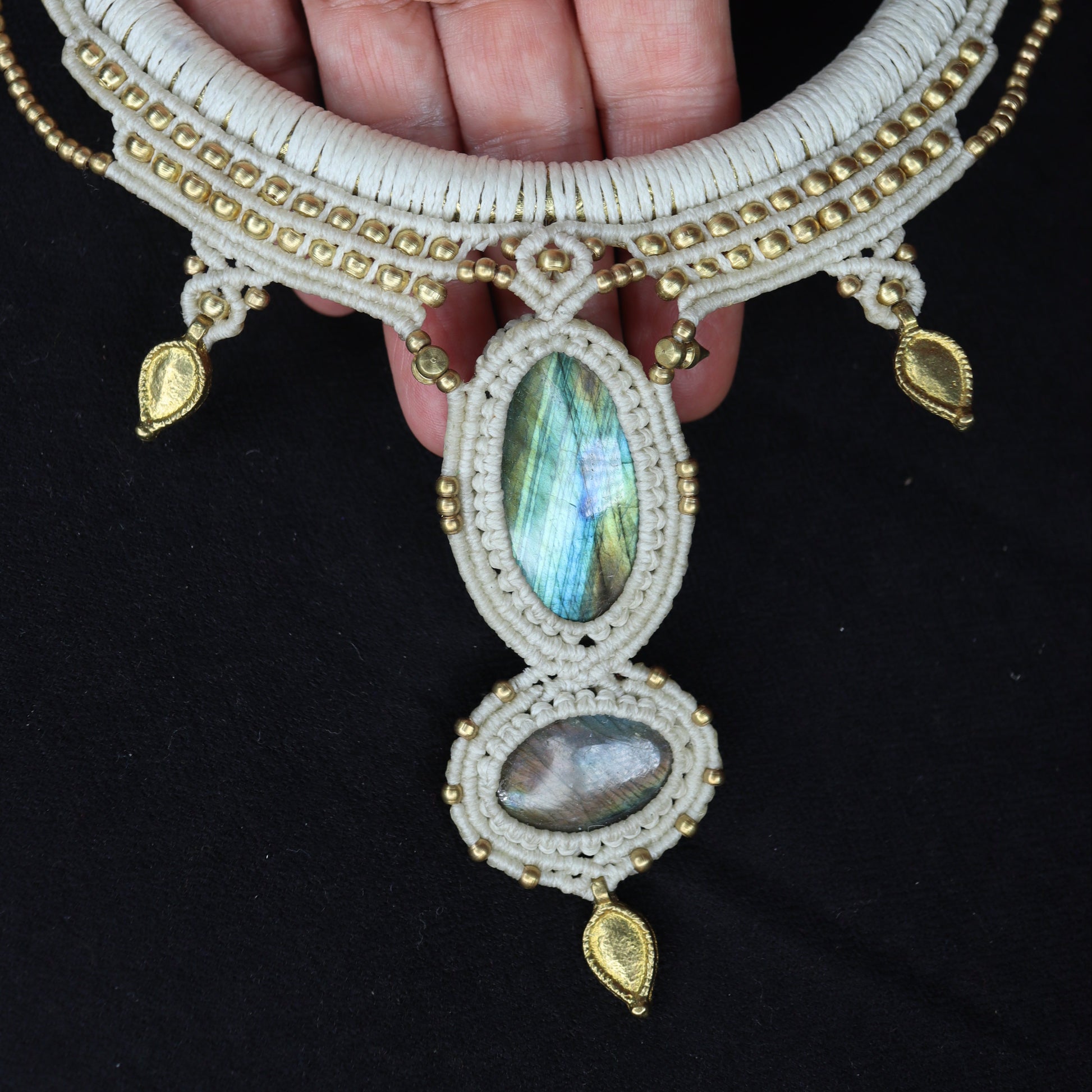 Die Macrameeknüpfung umrahmt bei diesen Steine, die nach hinten offen sind. Hier sind es zwei changierende blaue Labradorite.