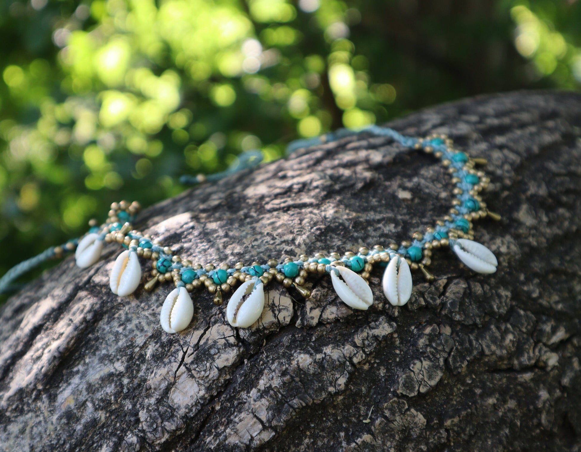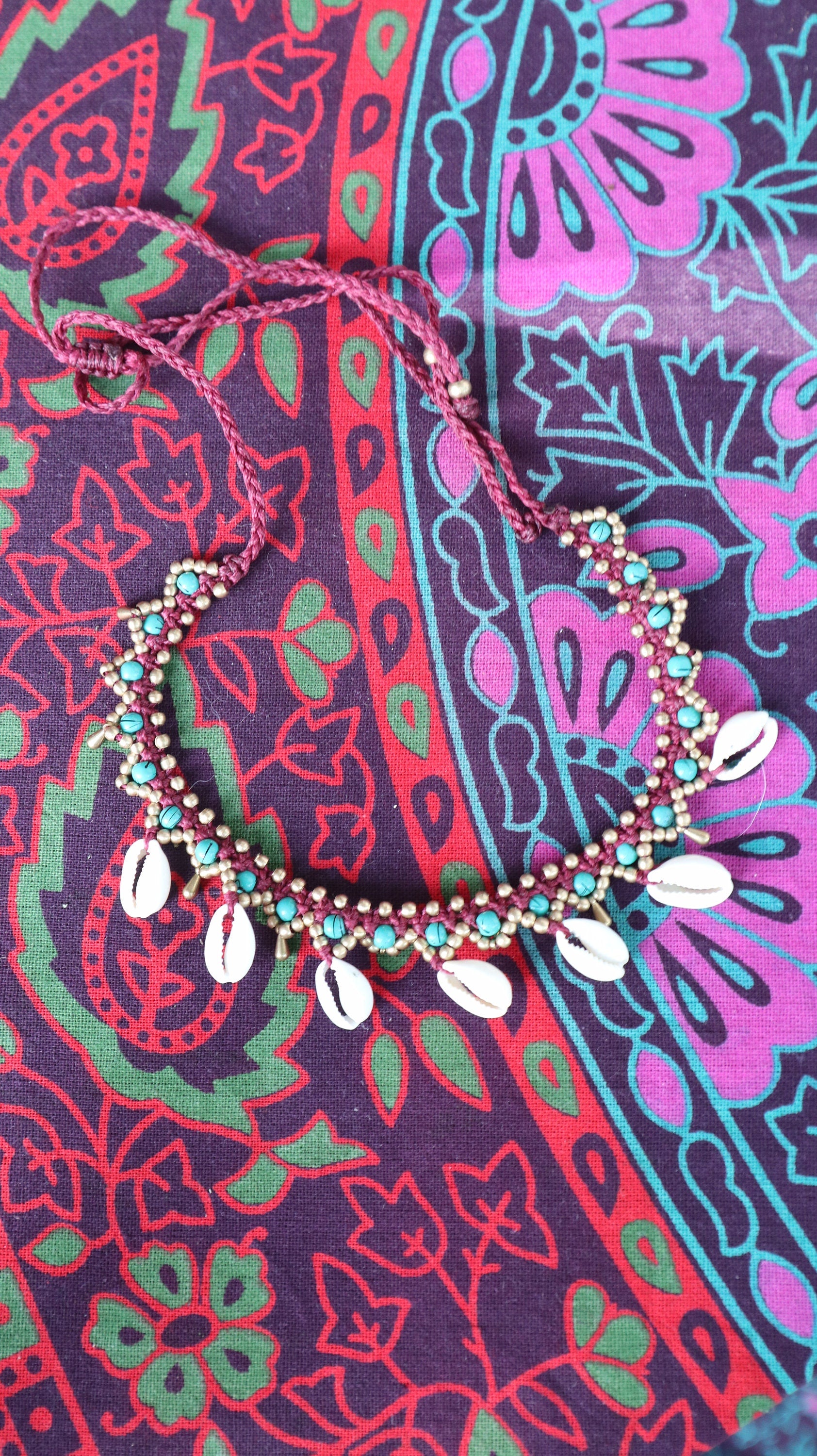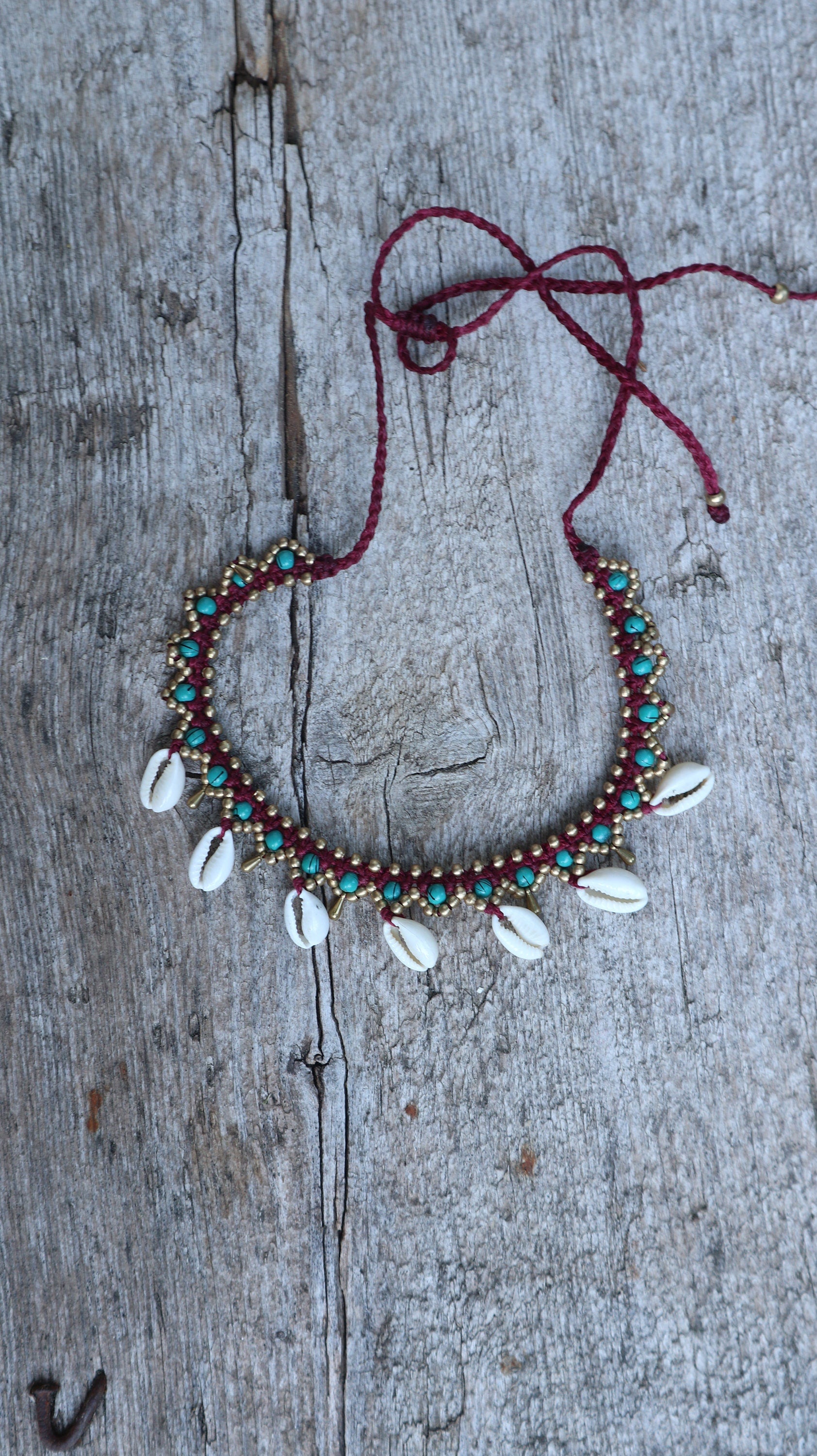 Sehr nicee handgeknüpfte Macrame Kette mit Caurimuscheln bemalten Glasperlen und Messingerlen. Sie ist verstellbar und daher für jede Größe tragbar.