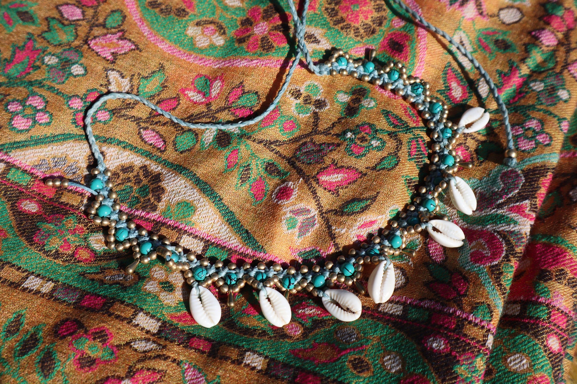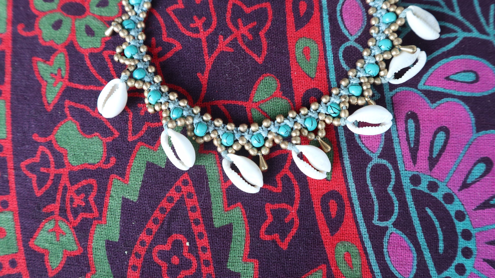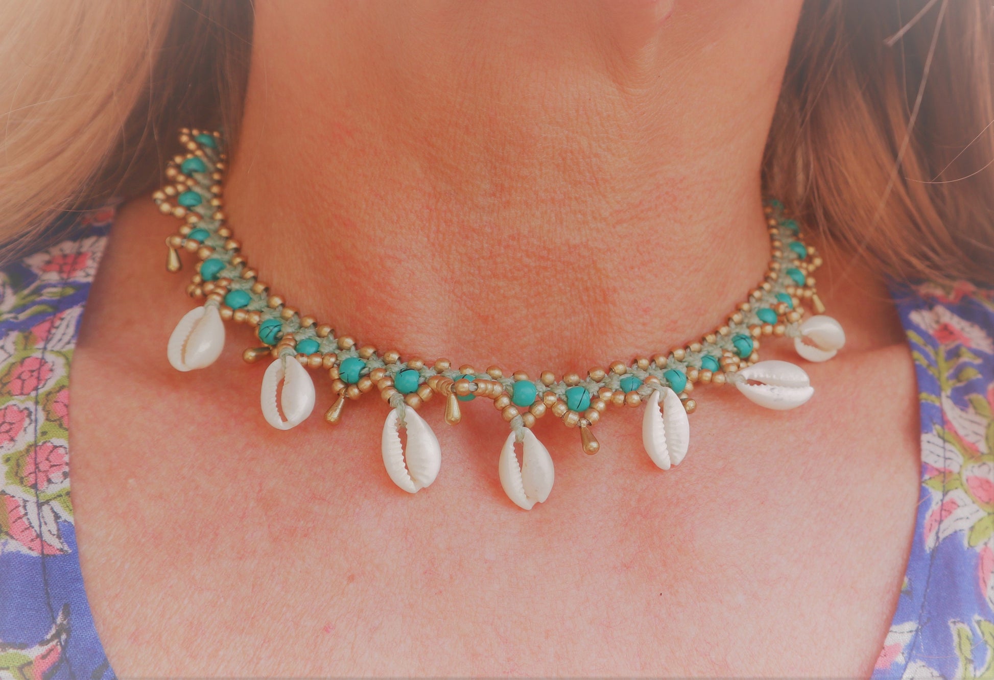 Sehr nicee handgeknüpfte Macrame Kette mit Caurimuscheln bemalten Glasperlen und Messingerlen. Sie ist verstellbar und daher für jede Größe tragbar.
