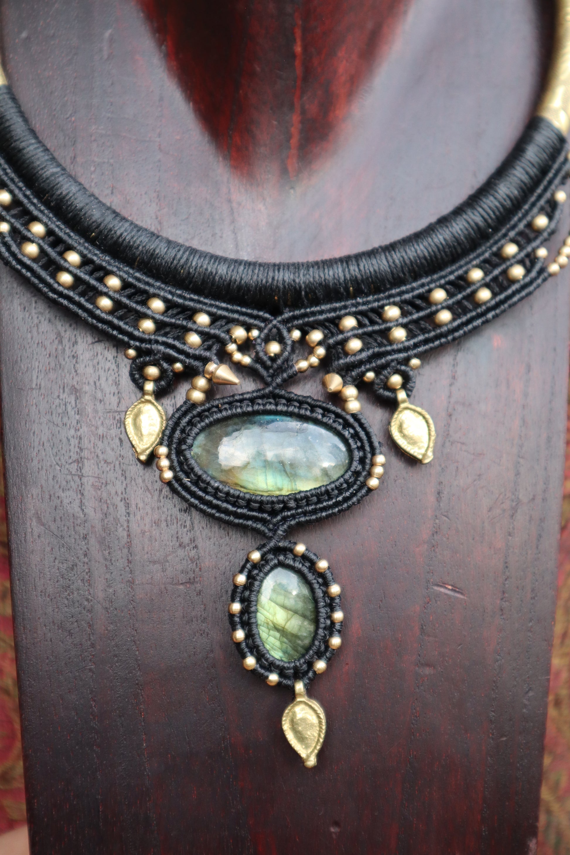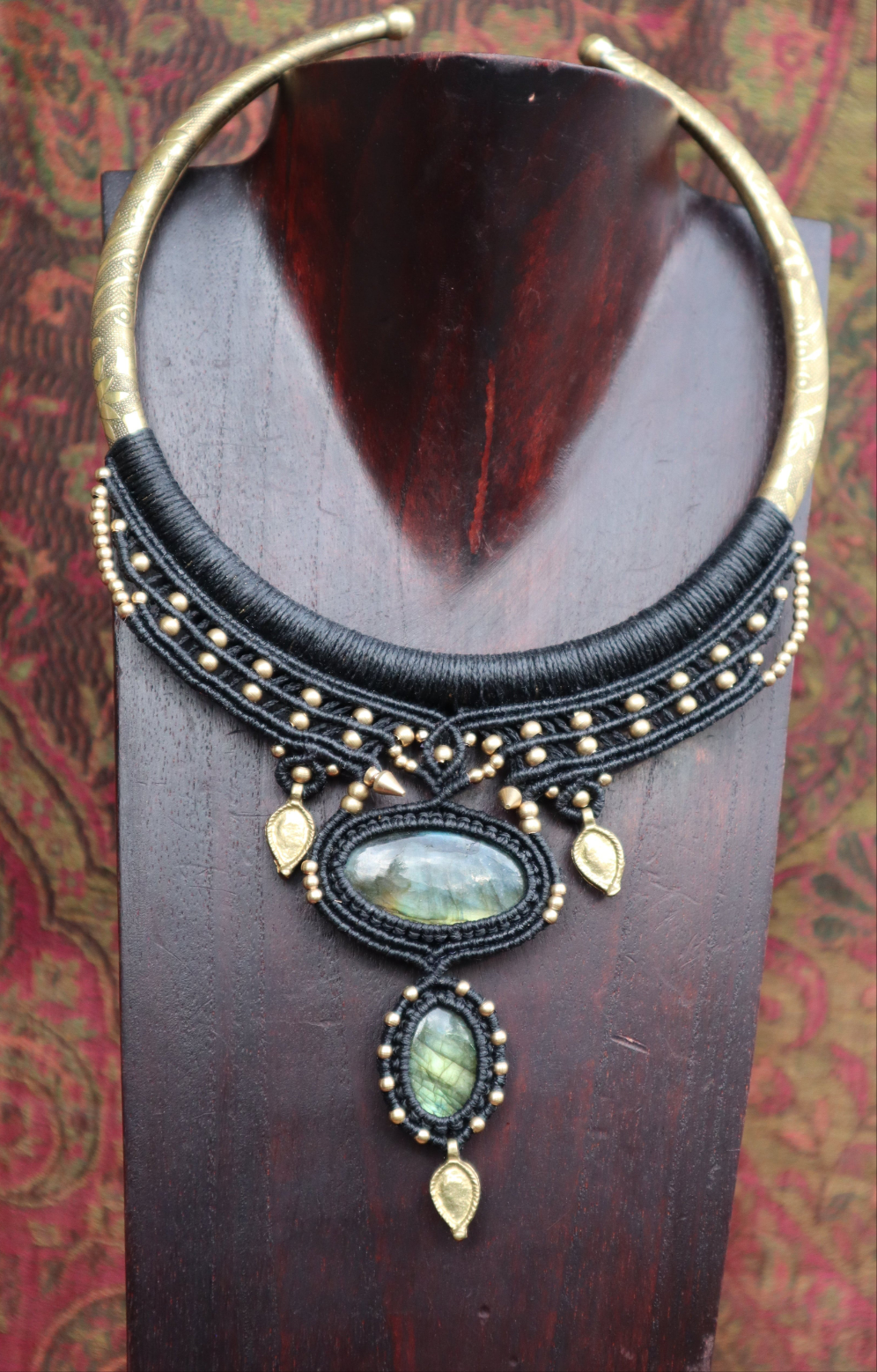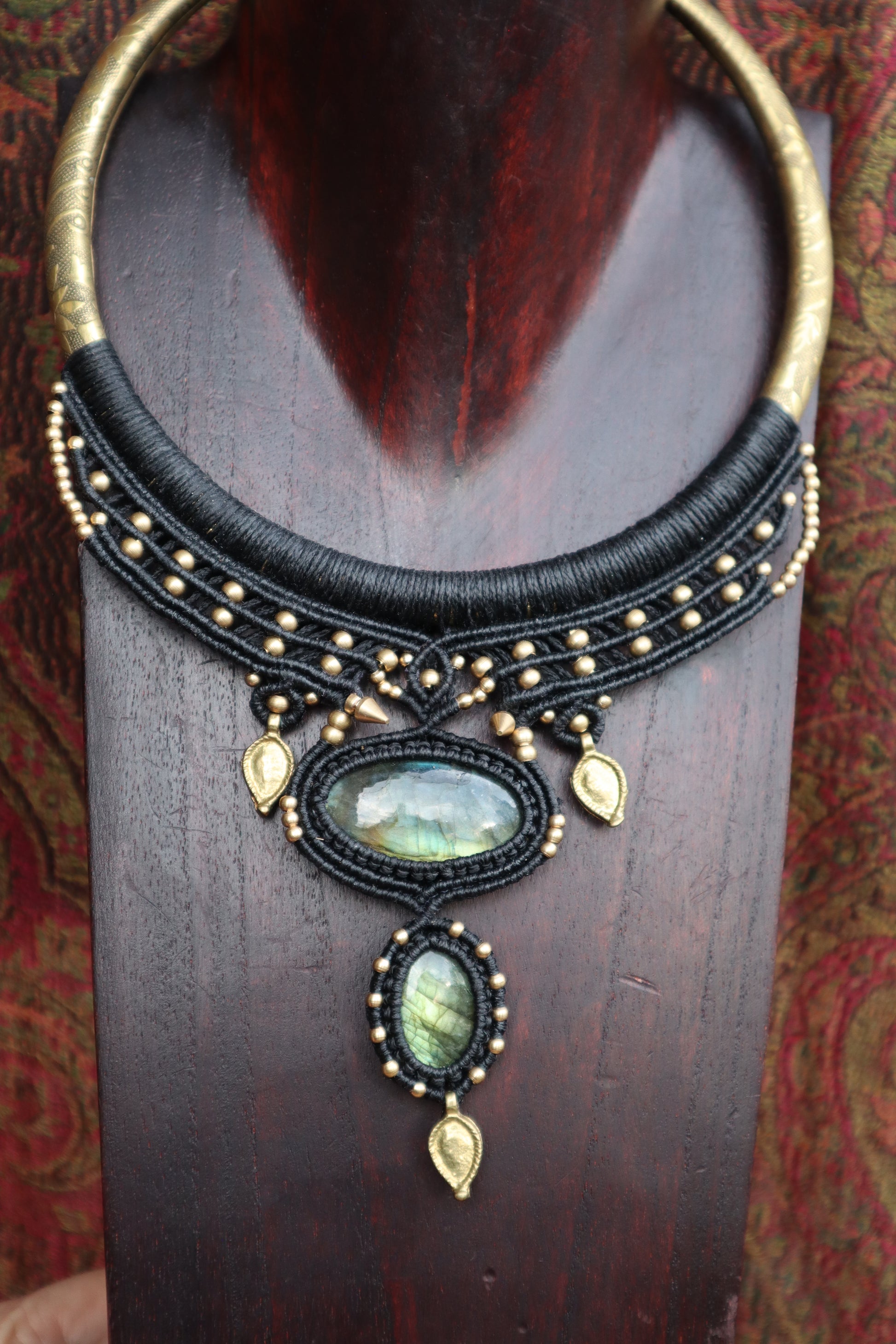 Halsreifen mit eingeknüften Edelsteinen sind Schmuckstücke mit Kompliment Garantie, wie dieser hier mit bezaubernden Labradoriten und goldfarbenen Messing Perlen und Elementen. Der Reifen und die Knüpfung wurden in Handarbeit hergestellt.