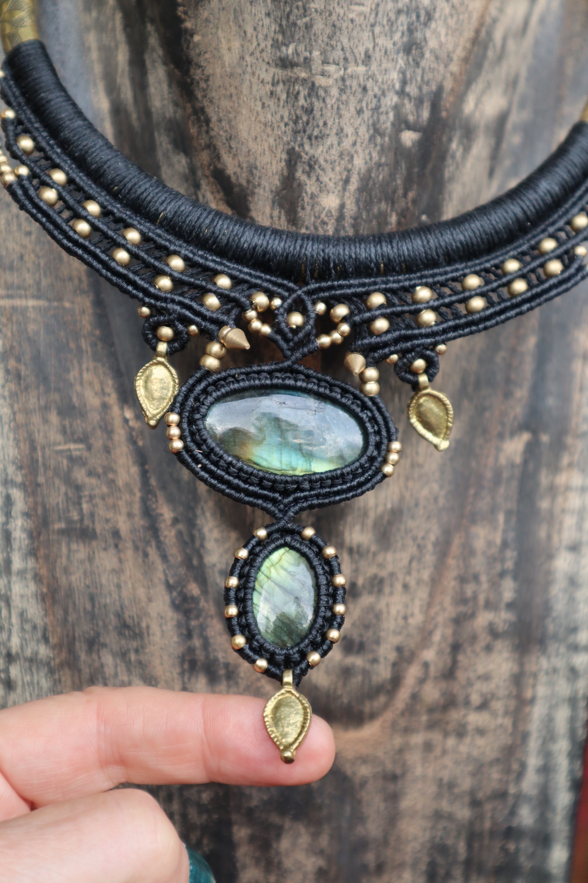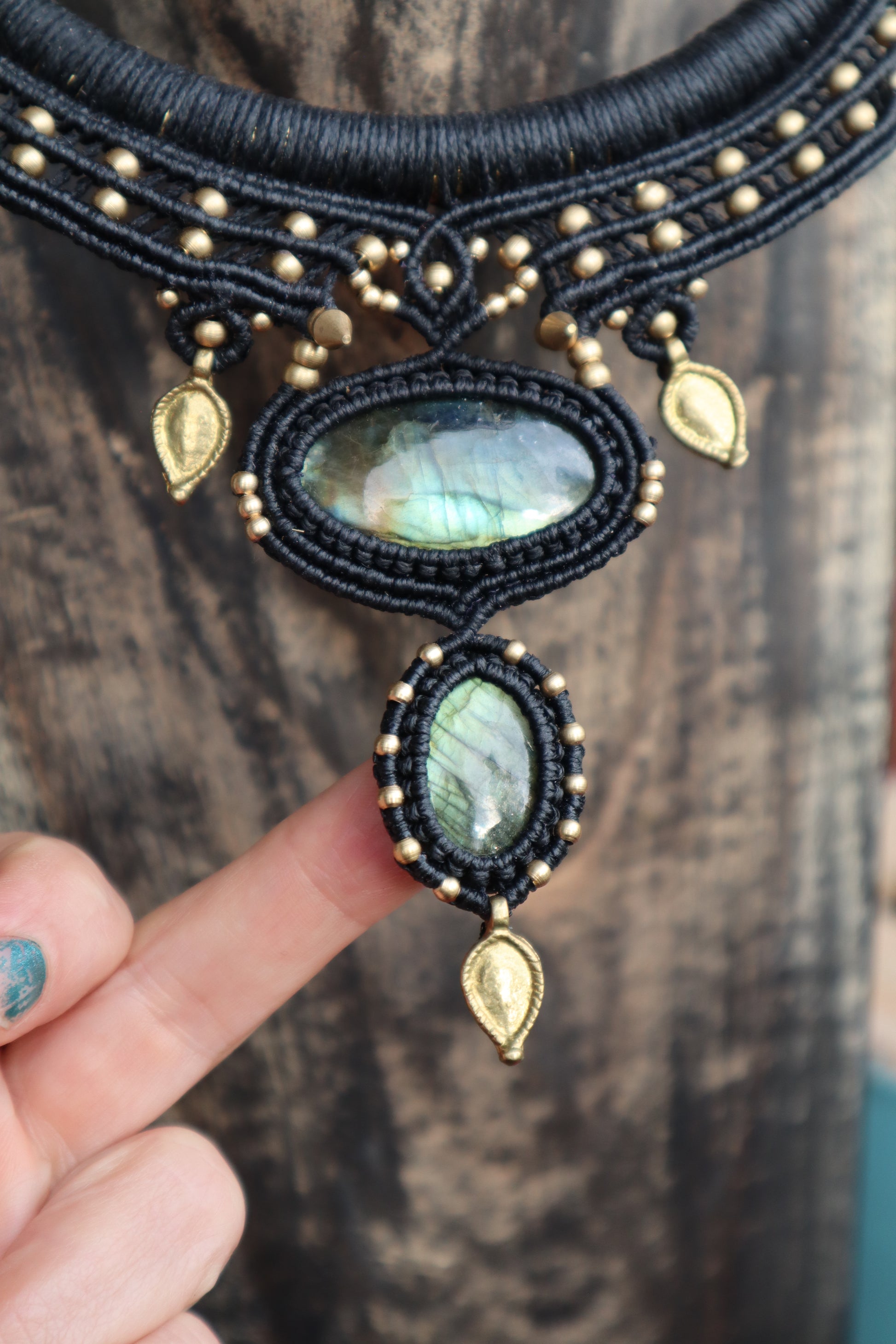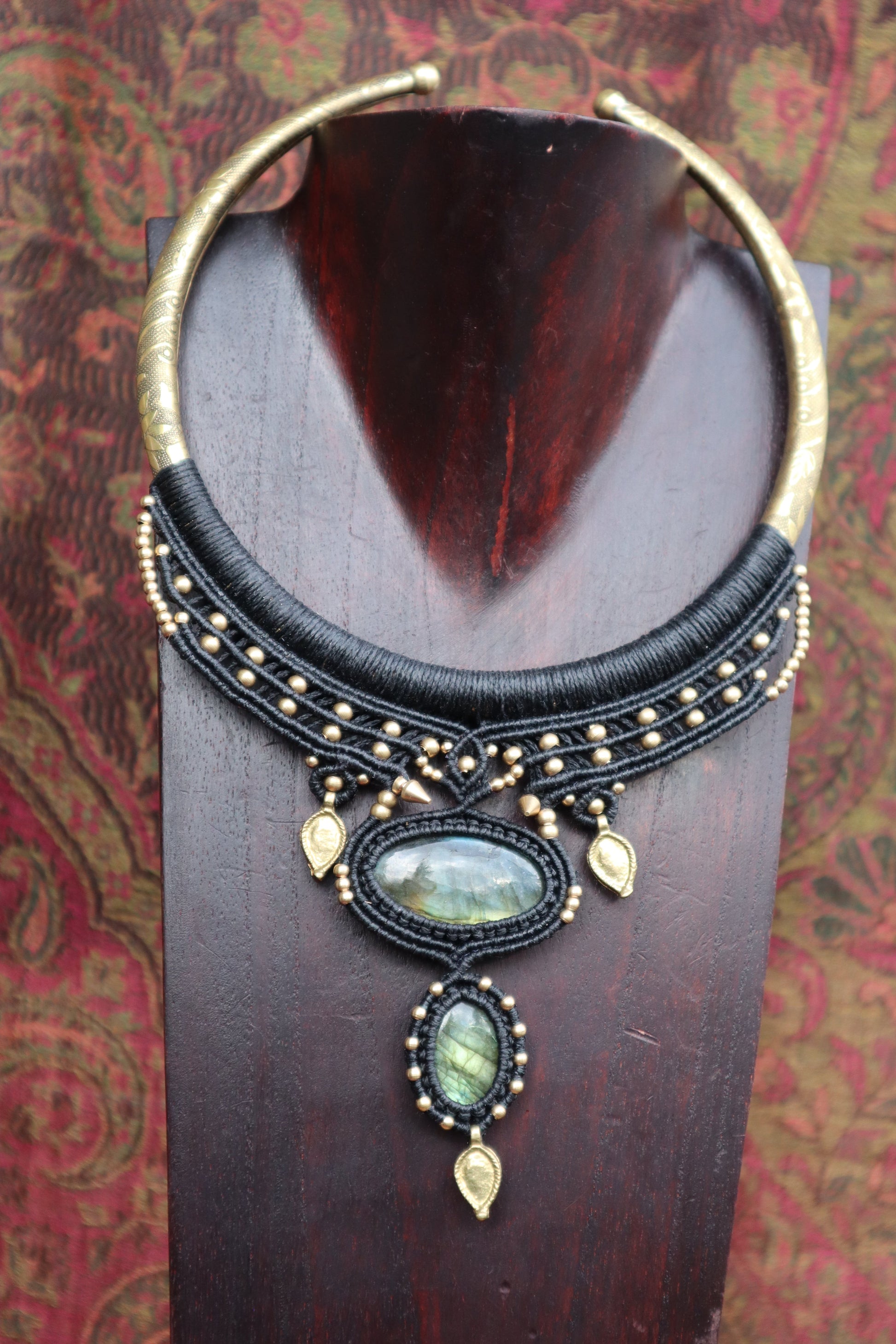 Halsreifen mit eingeknüften Edelsteinen sind Schmuckstücke mit Kompliment Garantie, wie dieser hier mit bezaubernden Labradoriten und goldfarbenen Messing Perlen und Elementen. Der Reifen und die Knüpfung wurden in Handarbeit hergestellt.