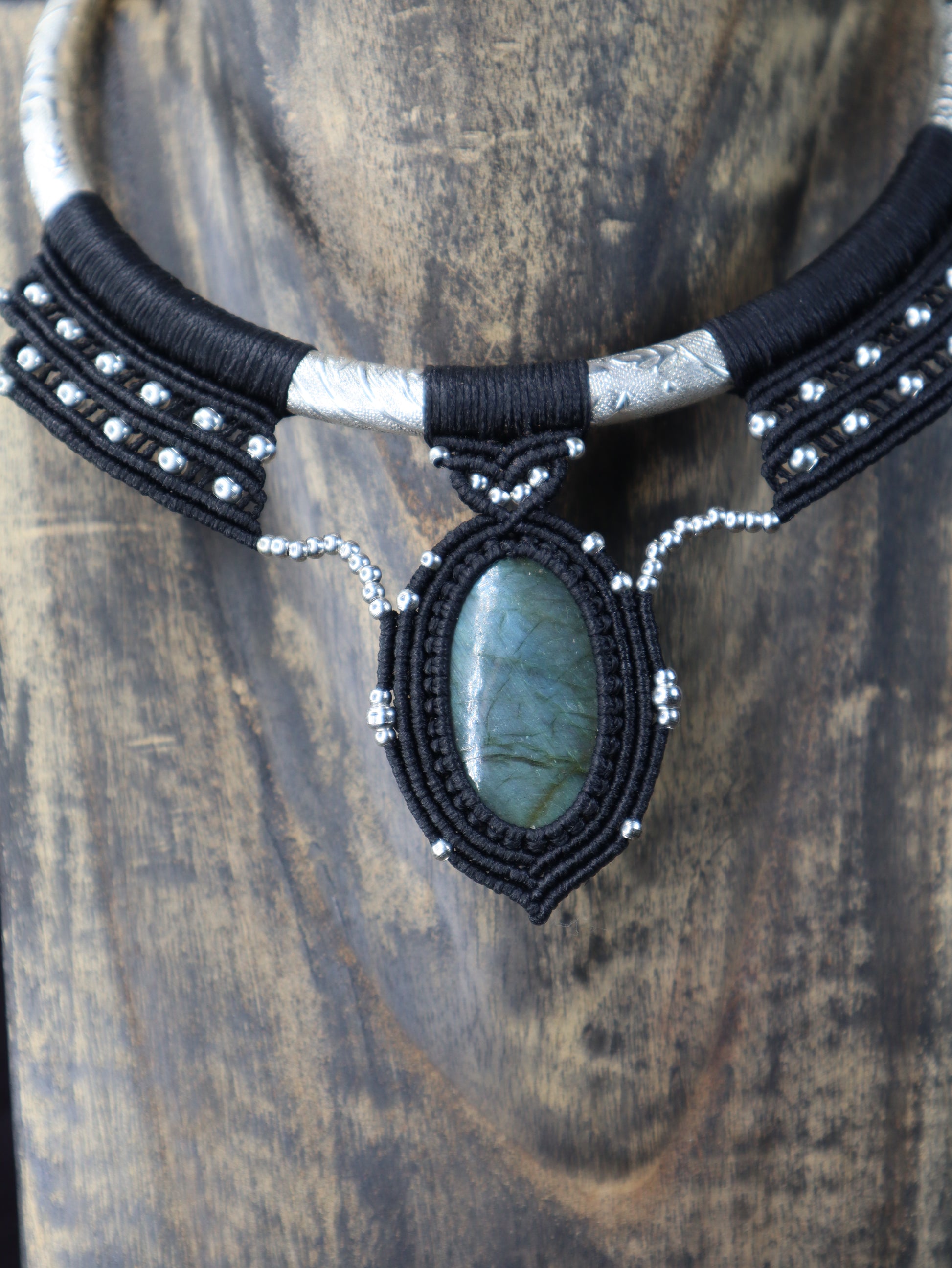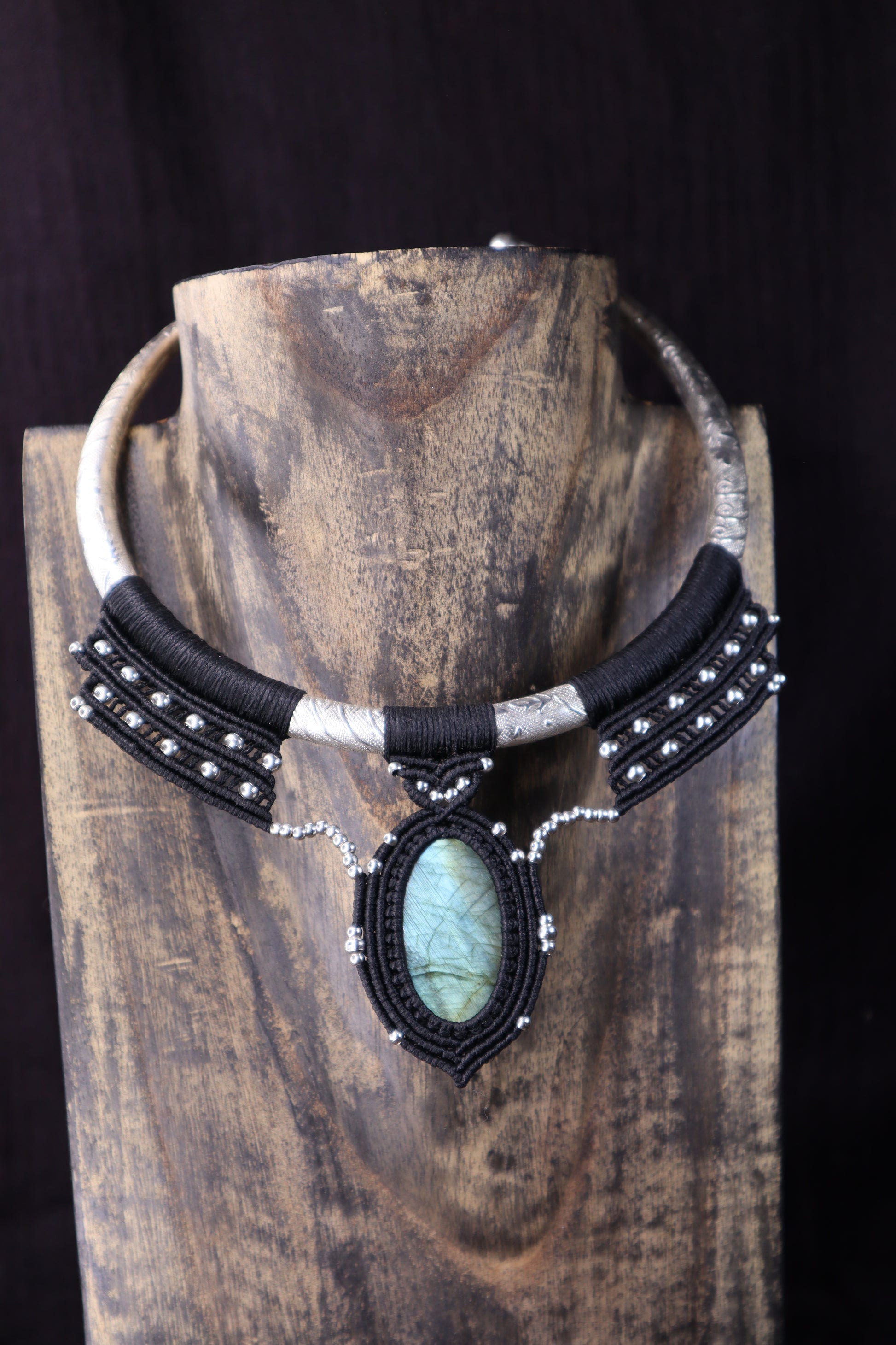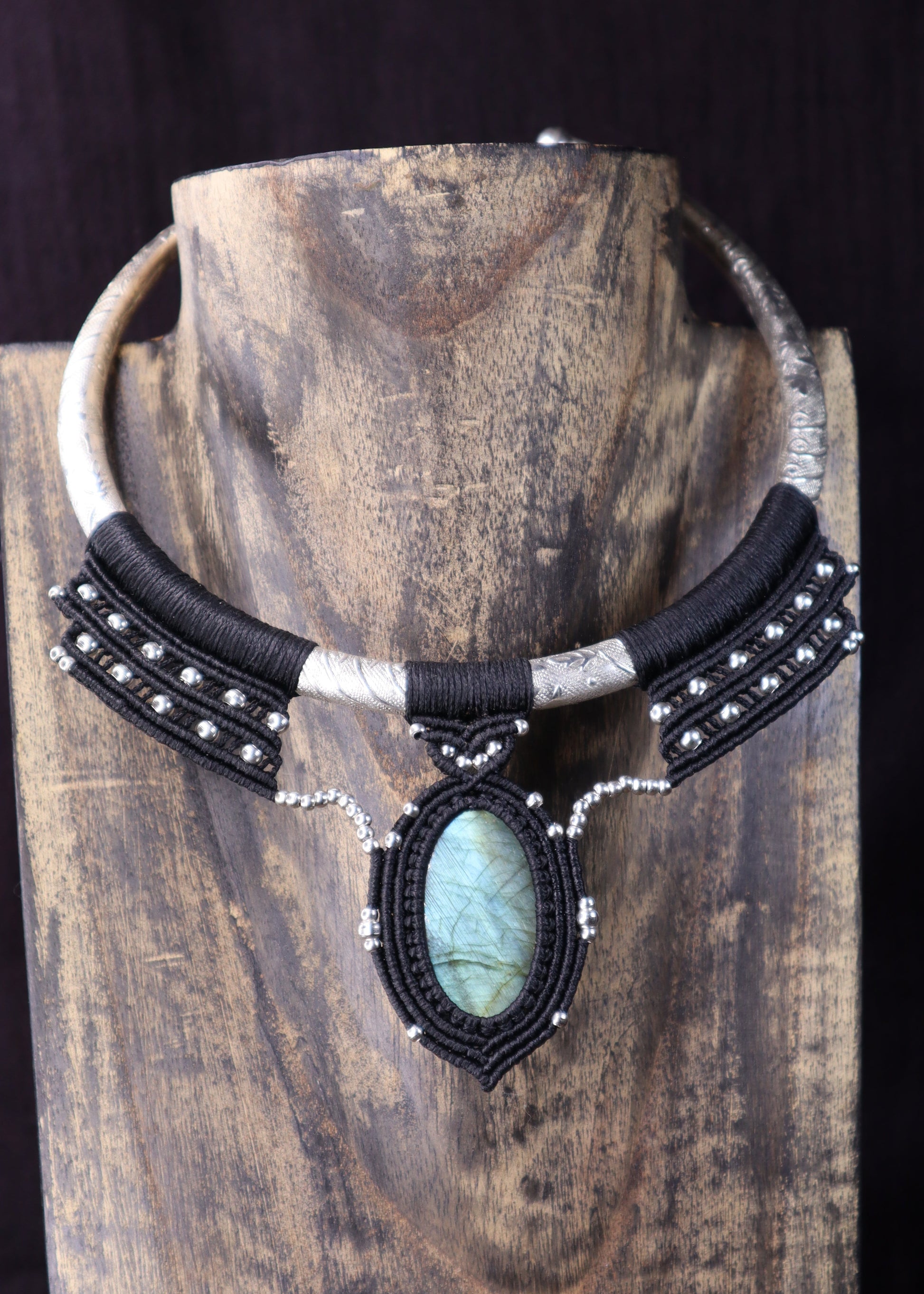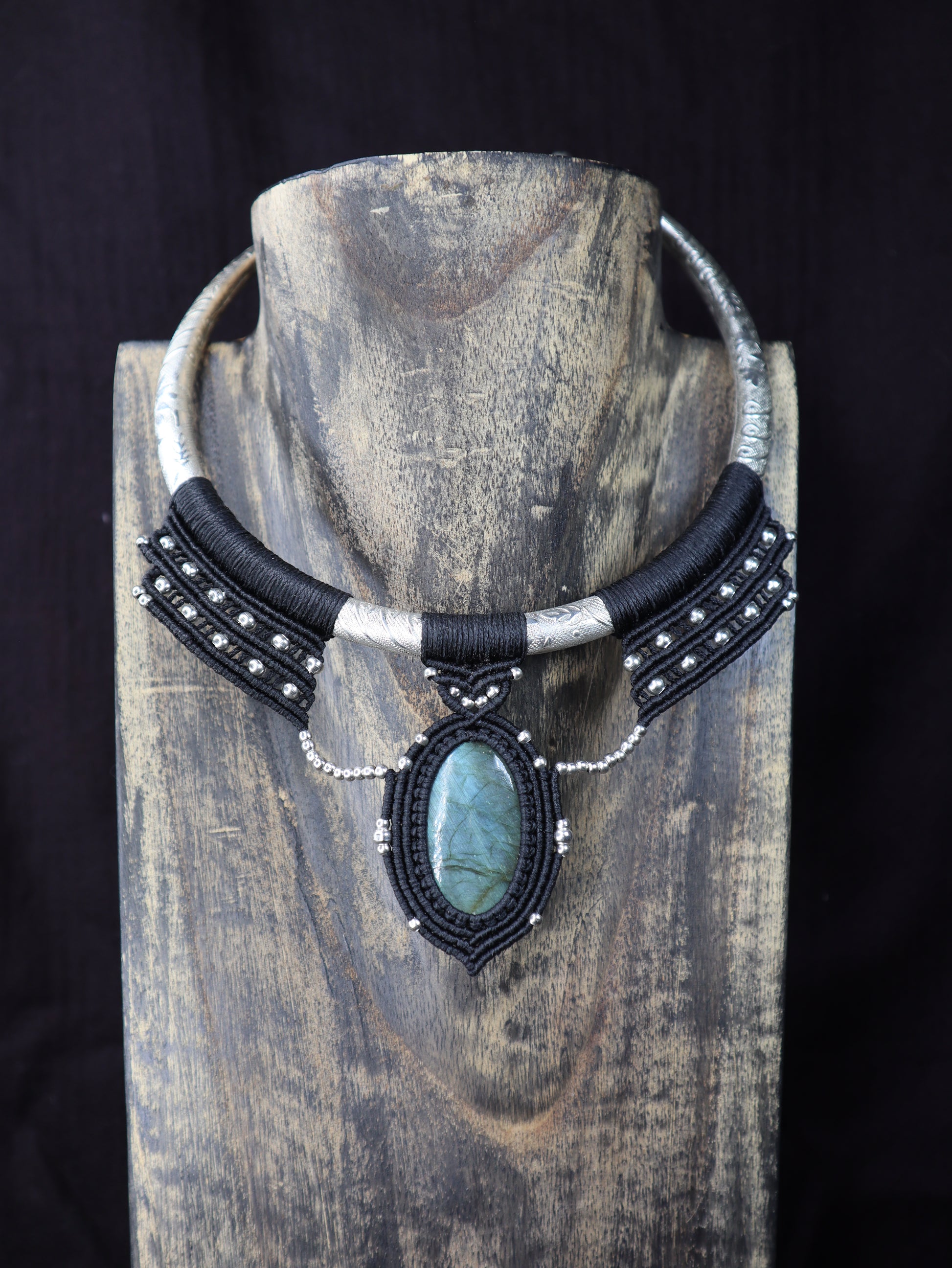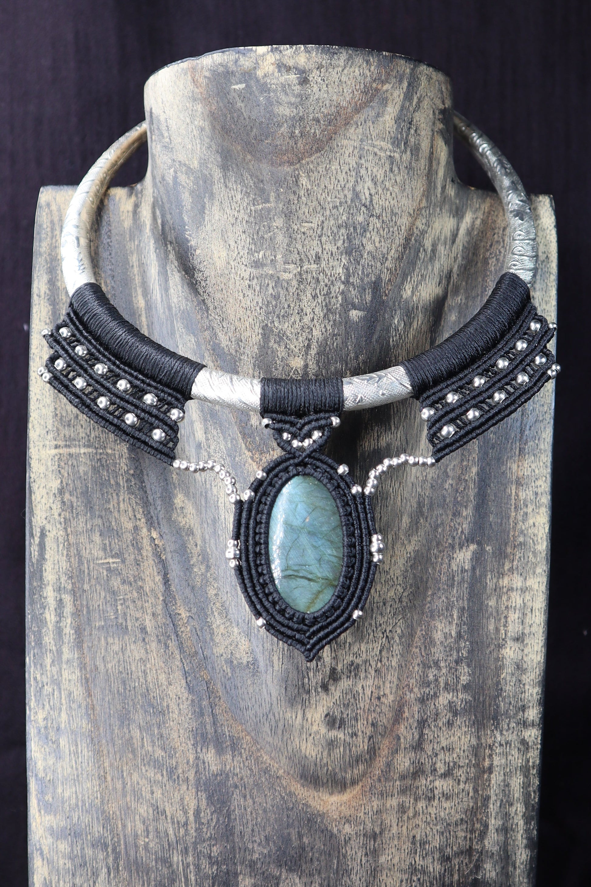 Eine einzigartige handgefertigte Halskette mit einem changierenden ovalen Edelstein, der in schwarzes Makramee gehüllt ist. Der Stein zeigt ein natürliches Schillern mit Blau- und Grünreflexen. Dieses Stück im auffälligen Choker-Stil verbindet Bohème-Eleganz mit handwerklicher Handwerkskunst und ist damit ein perfektes Statement-Accessoire für jeden Anlass.