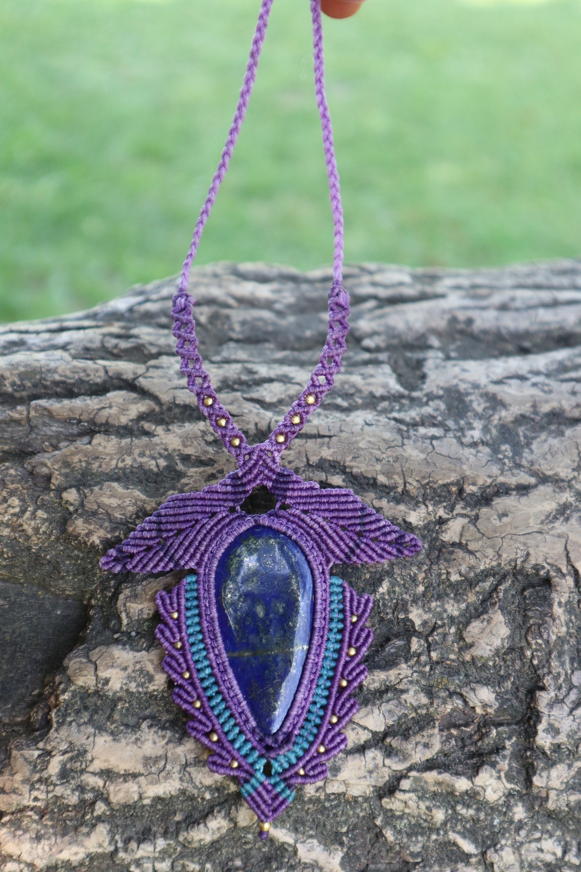 Einzigartige, wunderschöne, handgefertigte Makramee Halskette mit einem eingefasste Lapislazuli von schönstem Blau.